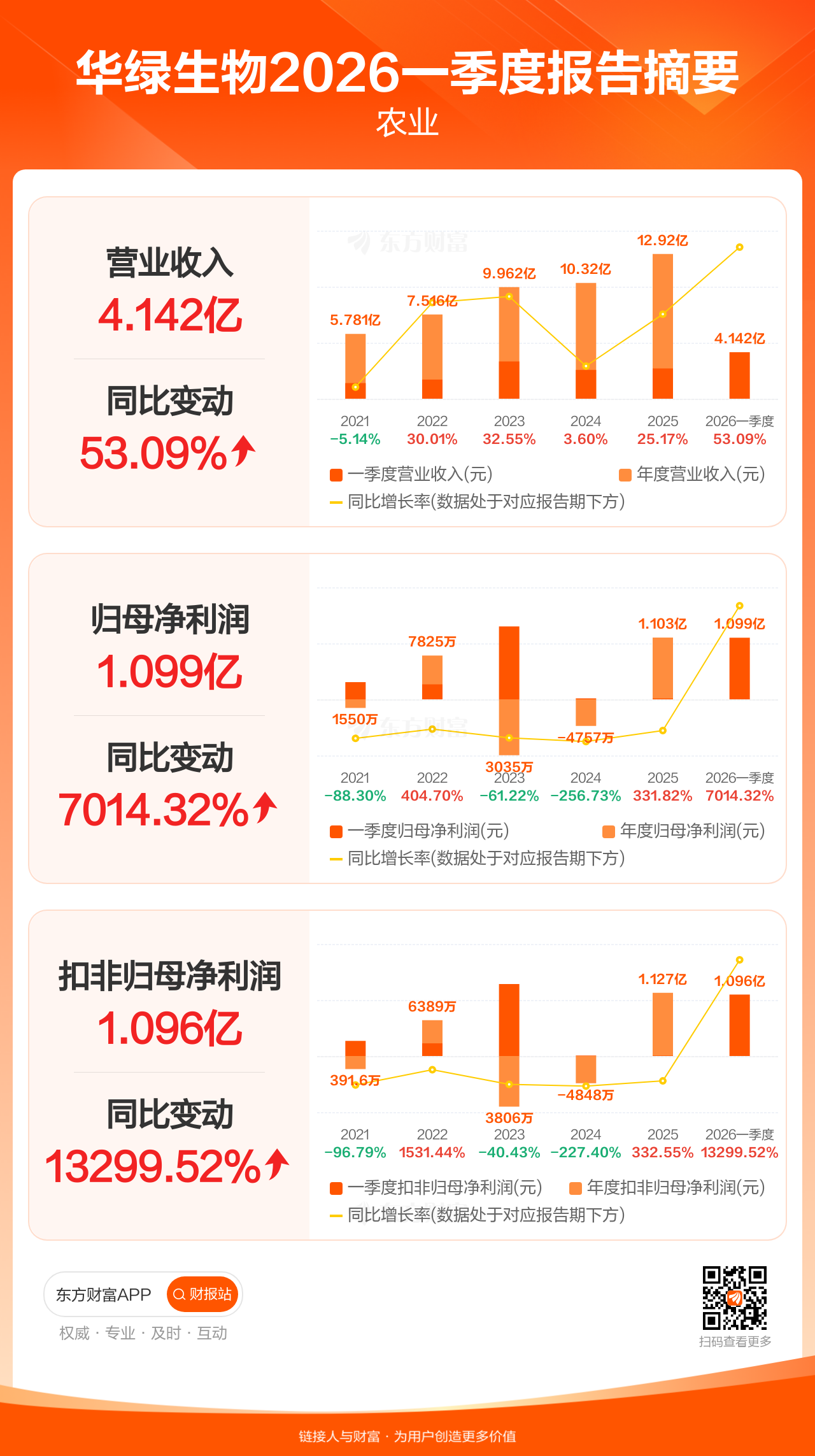 华绿生物4月22日发布2026年一季报显示,公司一季度实现营业收入4.14亿元,同比增长53.09%;归母净利润1.10亿元,同比增长7014.32%;扣非归母净利润1.10亿元,同比增长13299.52%。