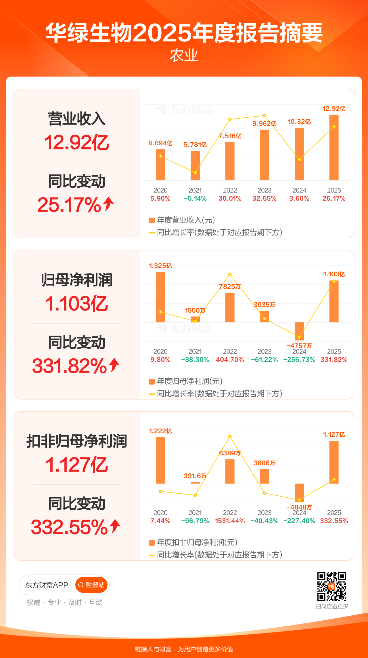 华绿生物4月22日发布2025年年报显示,公司全年实现营业收入12.92亿元,同比增长25.17%;归母净利润1.10亿元,同比增长331.82%;扣非归母净利润1.13亿元,同比增长332.55%。