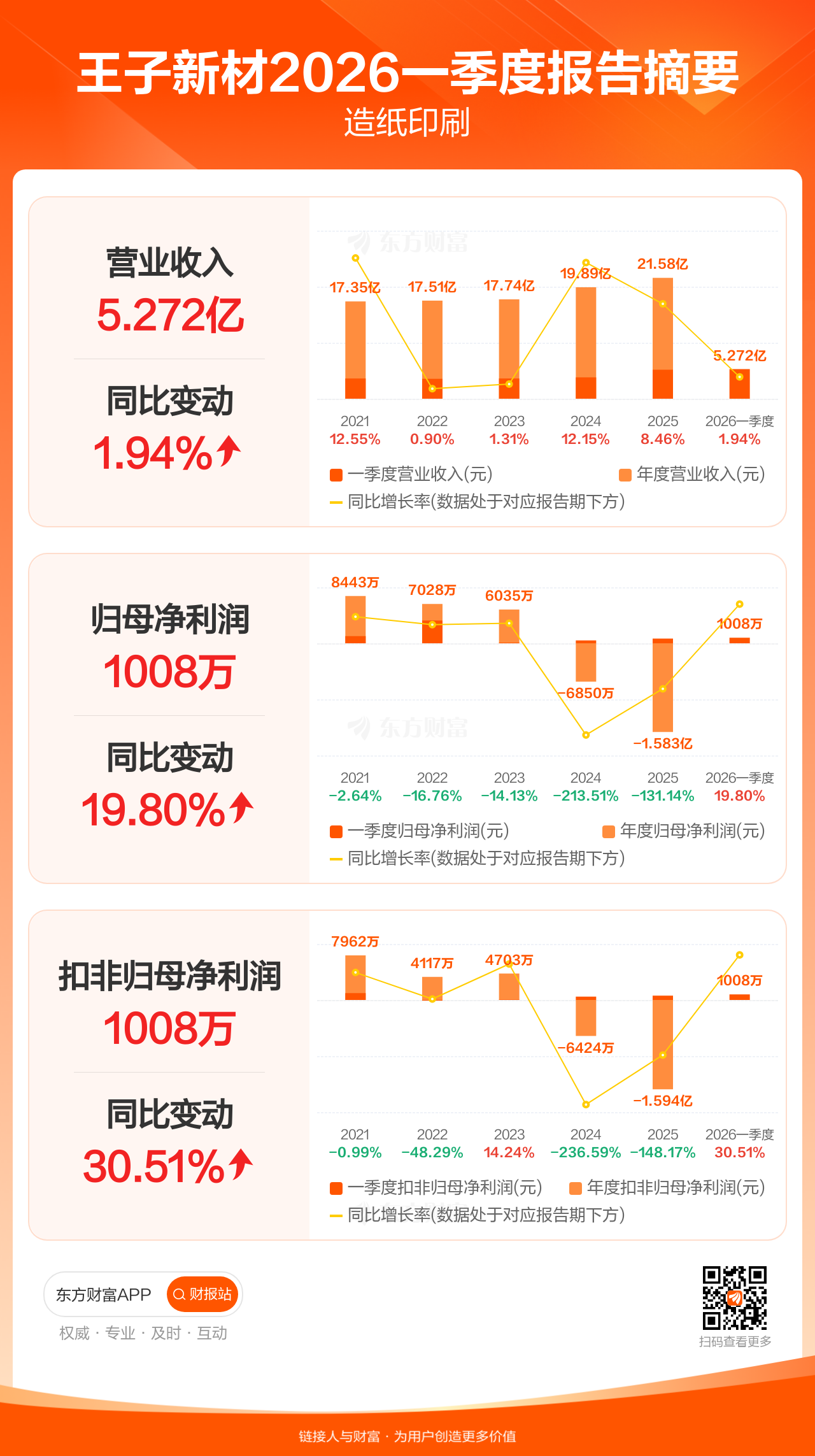 王子新材4月22日发布2026年一季报显示,公司一季度实现营业收入5.27亿元,同比增长1.94%;归母净利润1008.30万元,同比增长19.80%;扣非归母净利润1008.34万元,同比增长30.51%。