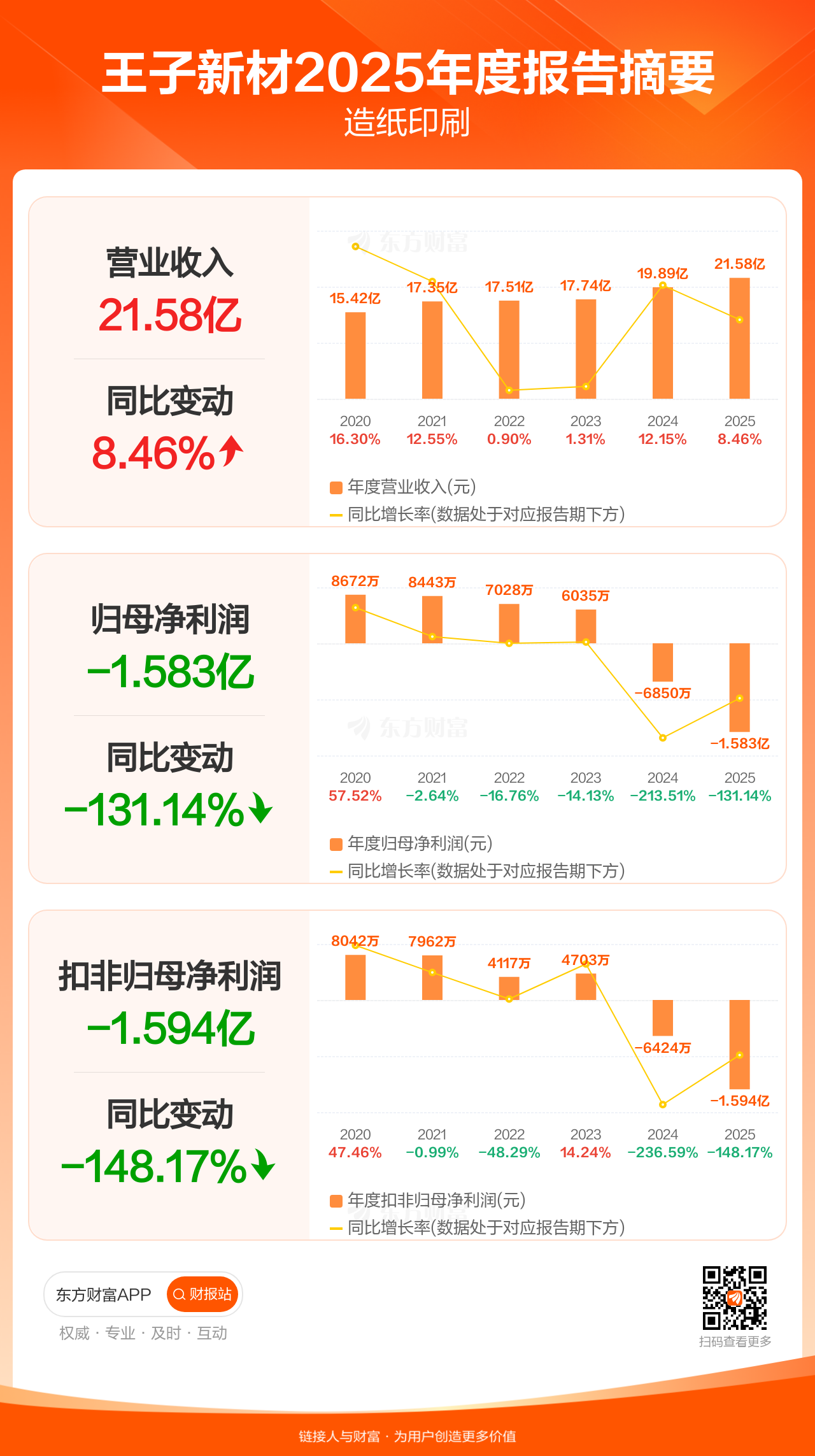 王子新材4月22日发布2025年年报显示,公司全年实现营业收入21.58亿元,同比增长8.46%;归母净利润-1.58亿元;扣非归母净利润-1.59亿元。