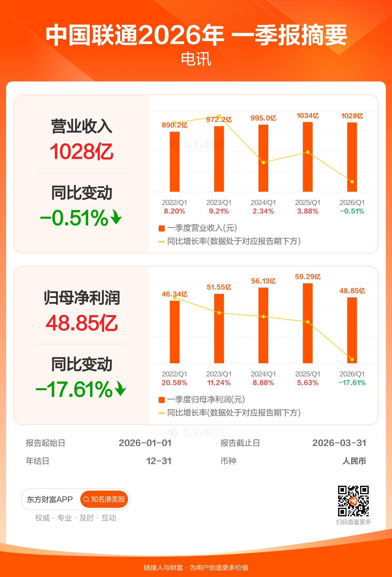 中国联通4月21日发布一季报业绩,截至2026年3月31日的3个月内,该公司营业收入1028.24亿人民币,同比减少0.51%;公司权益持有人应占溢利(归母净利润)48.85亿人民币,同比减少17.61%。