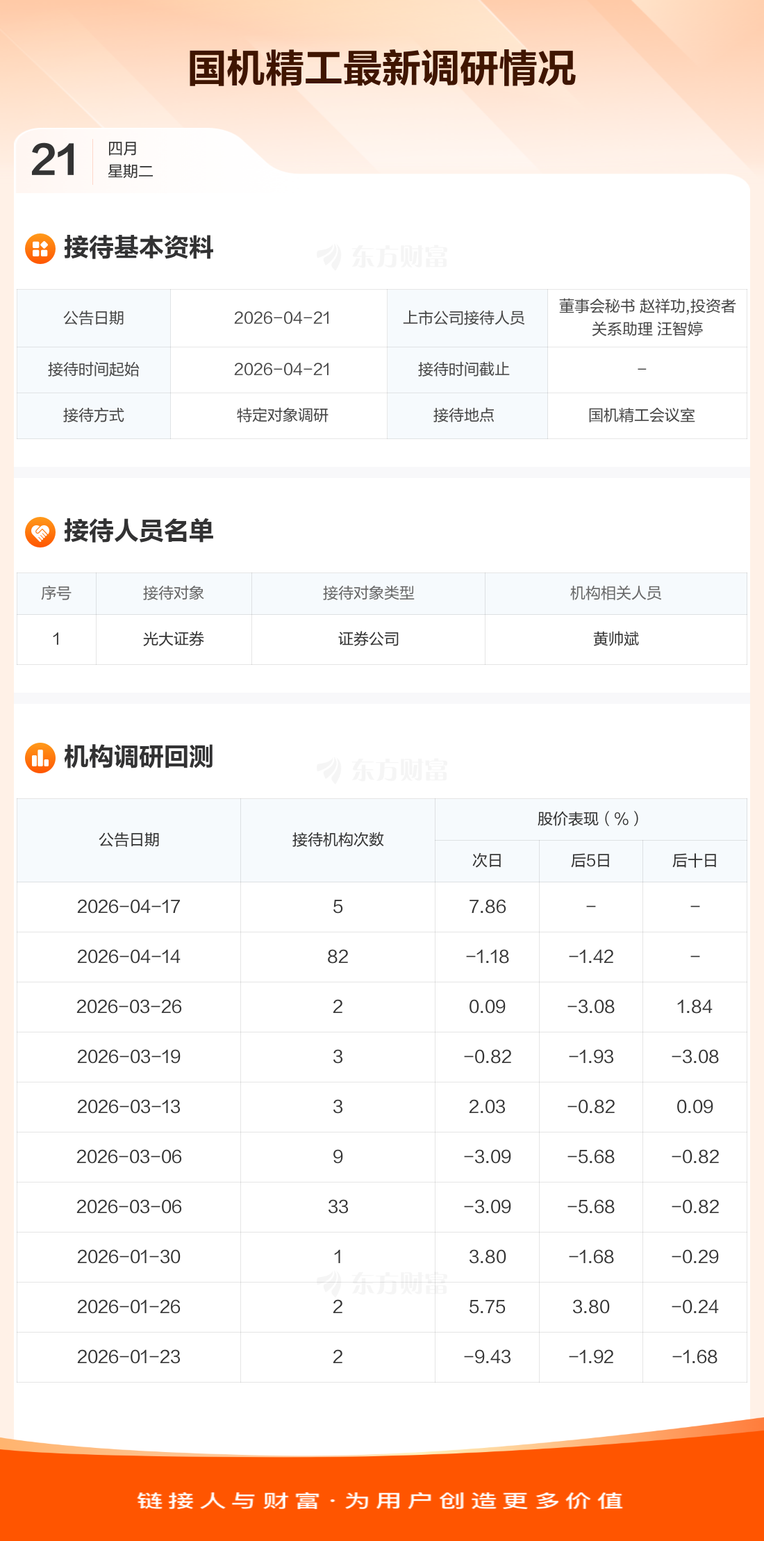 国机精工4月21日公告称,4月21日接待光大证券调研。接待人员包括董事会秘书 赵祥功,投资者关系助理 汪智婷。