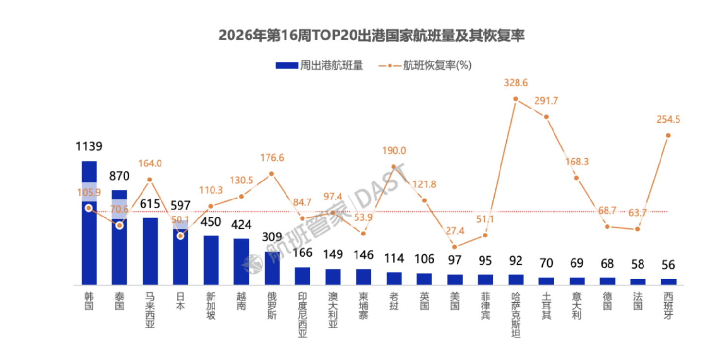 TOP20出港国家中,赴韩国航班量居第一,赴泰国航班量超7成,赴日本、柬埔寨、美国、菲律宾、德国、法国航班量恢复率在7成以下,赴韩国、马来西亚、新加坡、越南、俄罗斯、老挝、英国、哈萨克斯坦、土耳其、意大利、西班牙恢复率超100%。