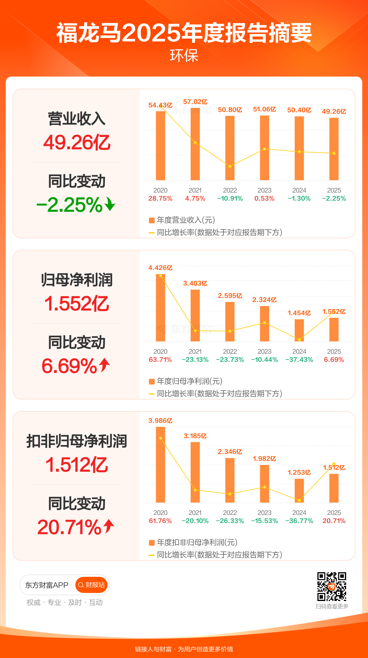 福龙马4月22日发布2025年年报显示,公司全年实现营业收入49.26亿元,同比下滑2.25%;归母净利润1.55亿元,同比增长6.69%;扣非归母净利润1.51亿元,同比增长20.71%。