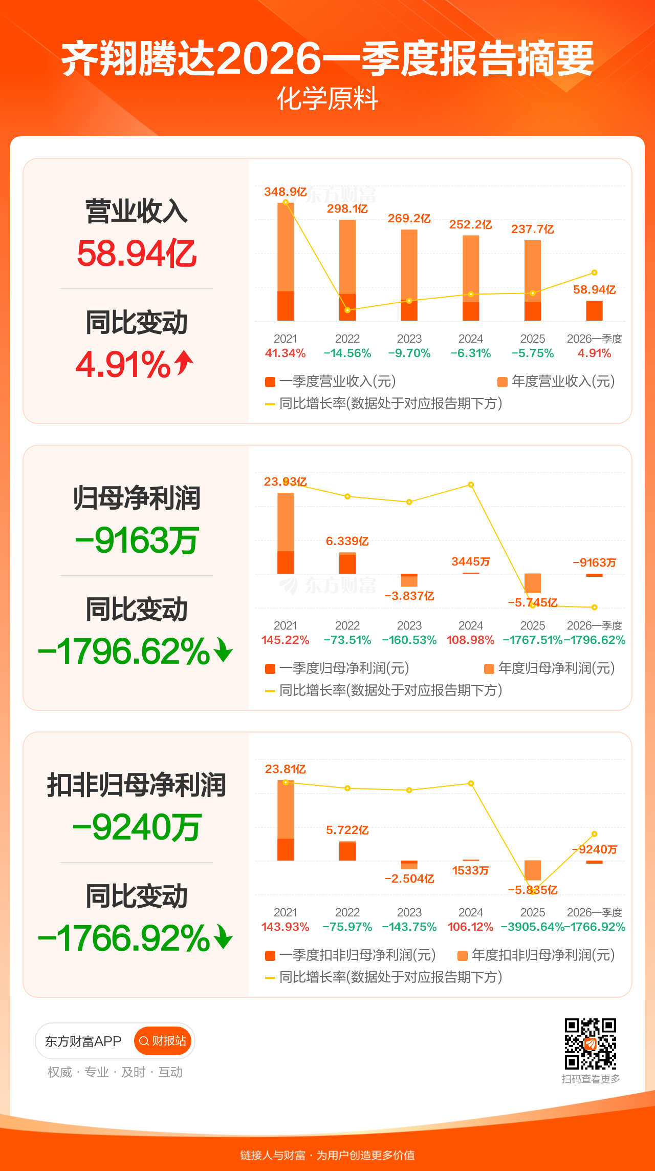 齐翔腾达4月22日发布2026年一季报显示,公司一季度实现营业收入58.94亿元,同比增长4.91%;归母净利润-9163.00万元;扣非归母净利润-9240.03万元。