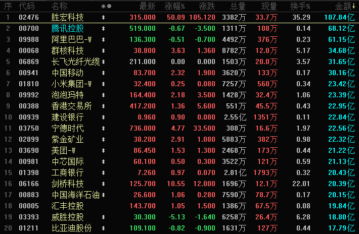 南向资金今日净买入港股37.38亿港元。南向资金今日成交额826.54亿港元,港股大市成交2051.77亿港元。南向十大成交股中,中国移动、工商银行、建设银行分别获净买入10.67亿港元、7.99亿港元、7.89亿港元。阿里巴巴-W、长飞光纤光缆、康方生物分别遭净卖出6.06亿港元、1.96亿港元、1.80亿港元。