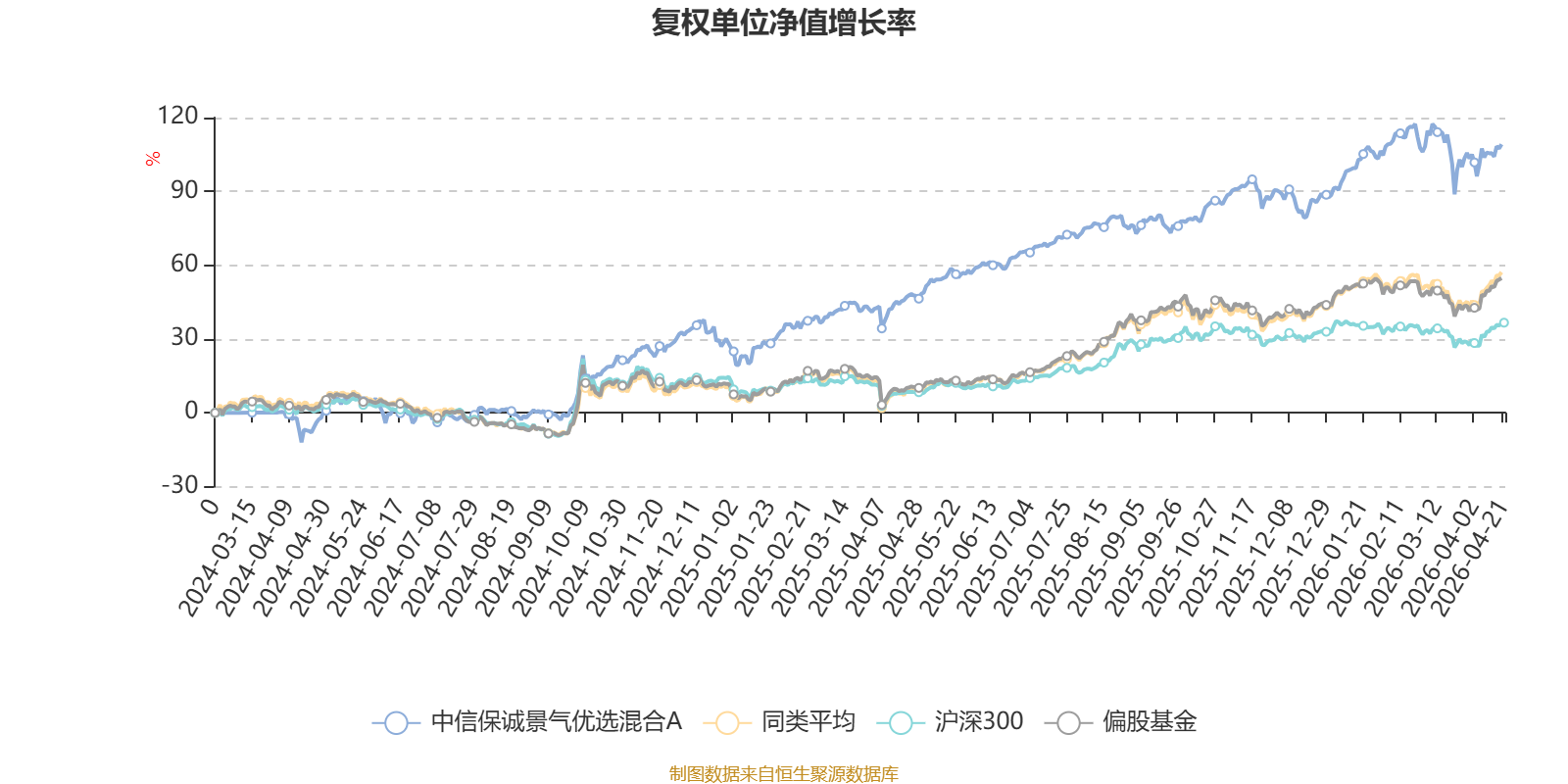 截至4月20日,中信保诚景气优选混合A近三个月复权单位净值增长率为3.01%,位于同类可比基金247/621;近半年复权单位净值增长率为15.96%,位于同类可比基金212/621;近一年复权单位净值增长率为43.49%,位于同类可比基金281/618。