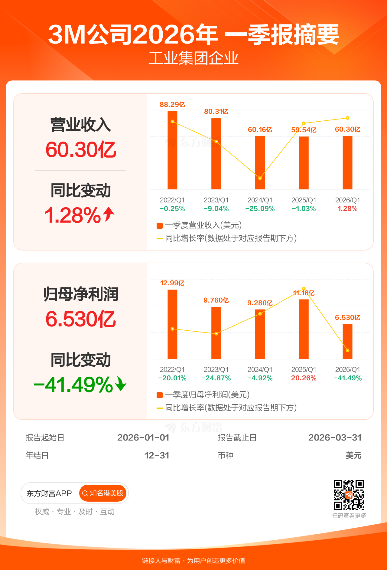 3M公司4月21日发布一季报业绩,截至2026年3月31日的3个月内,该公司营业收入60.30亿美元,同比增长1.28%;公司权益持有人应占溢利(归母净利润)6.53亿美元,同比减少41.49%。