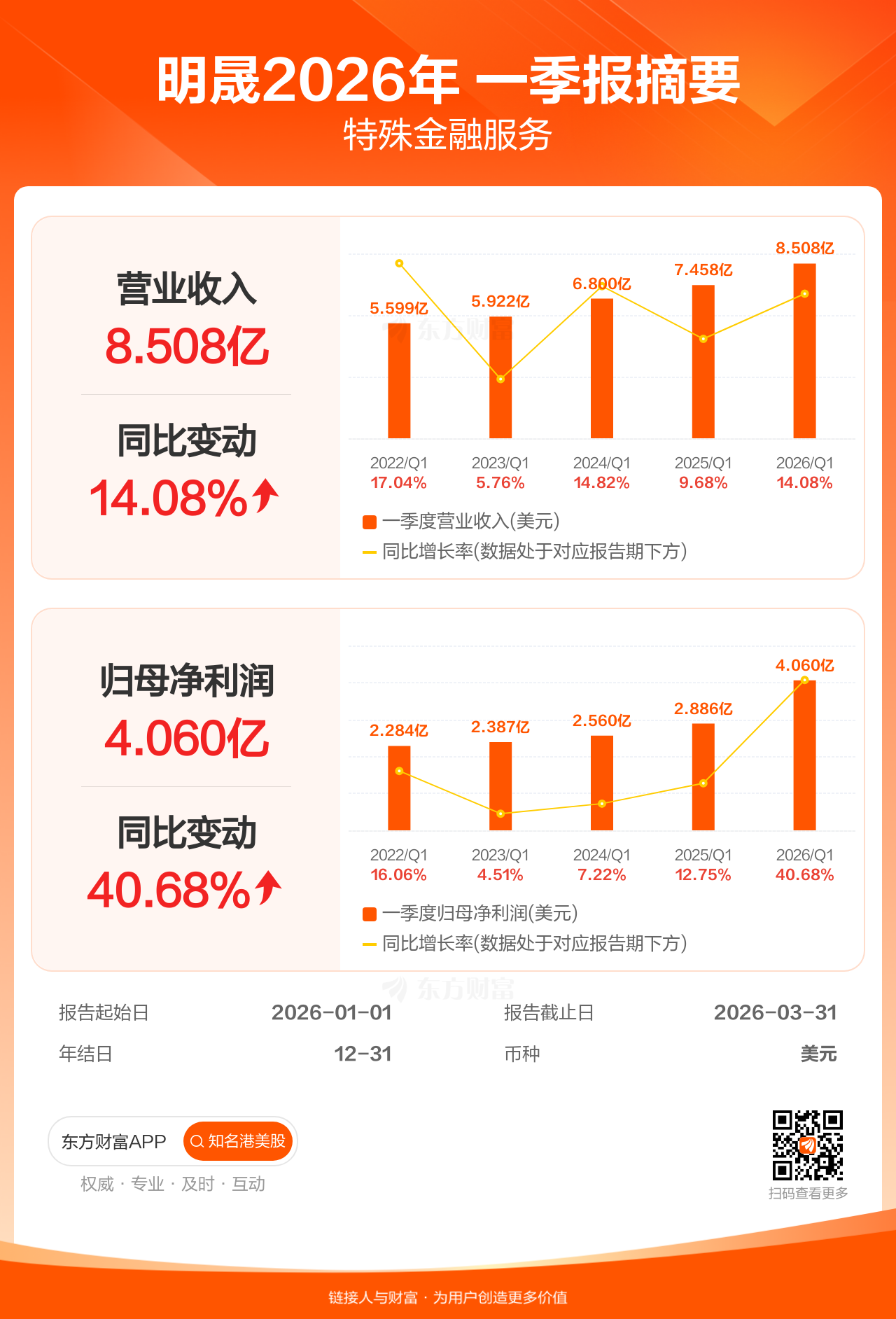 明晟4月21日发布一季报业绩,截至2026年3月31日的3个月内,该公司营业收入8.51亿美元,同比增长14.08%;公司权益持有人应占溢利(归母净利润)4.06亿美元,同比增长40.68%。
