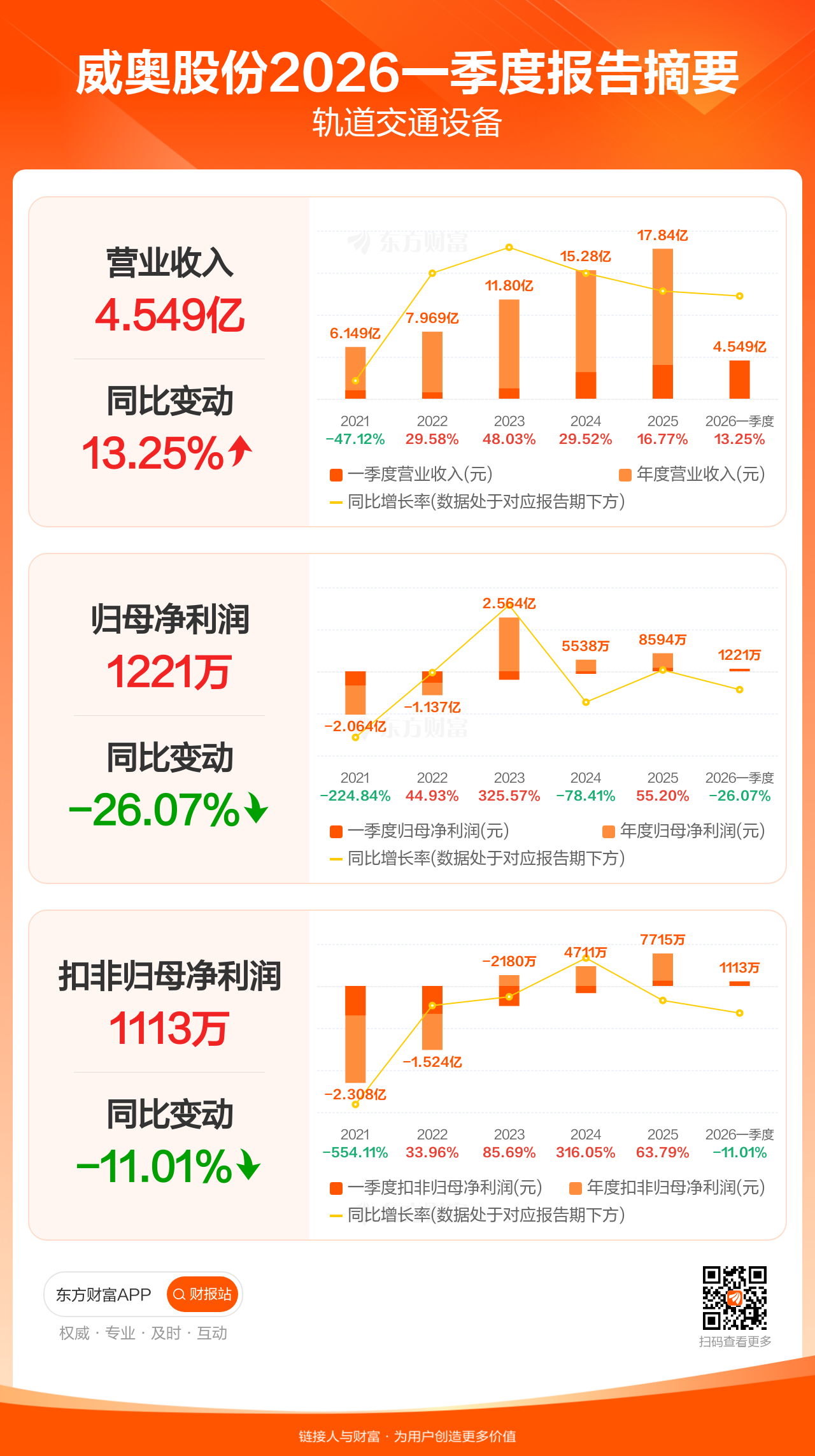 威奥股份4月22日发布2026年一季报显示,公司一季度实现营业收入4.55亿元,同比增长13.25%;归母净利润1220.66万元,同比下滑26.07%;扣非归母净利润1112.86万元,同比下滑11.01%。