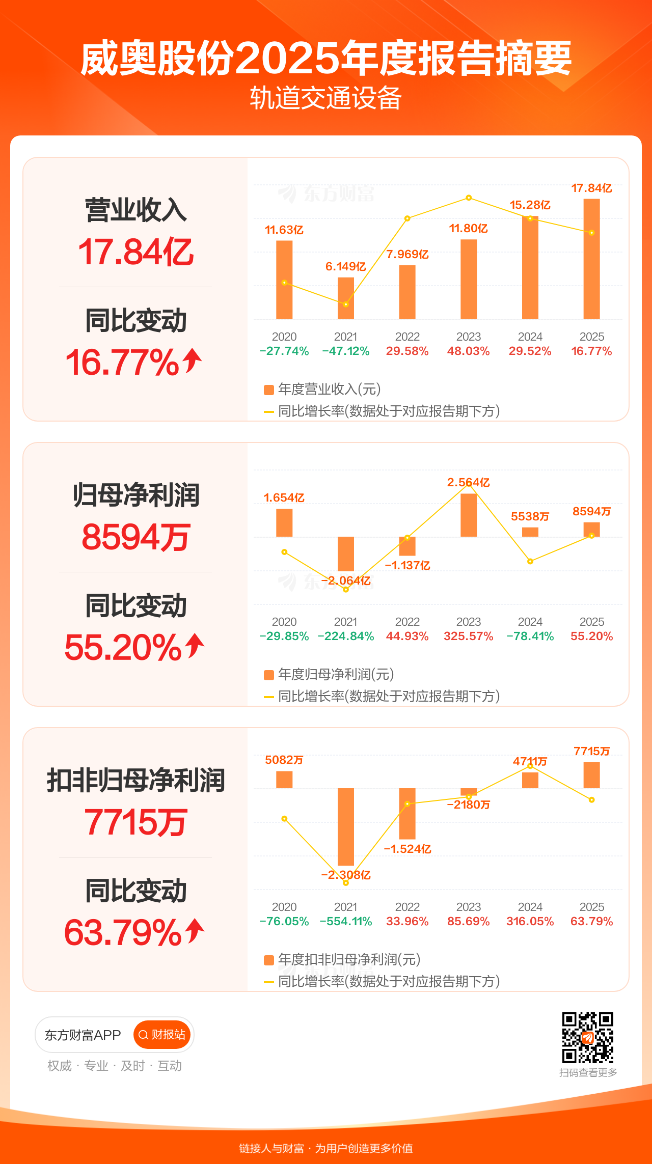 威奥股份4月22日发布2025年年报显示,公司全年实现营业收入17.84亿元,同比增长16.77%;归母净利润8594.01万元,同比增长55.20%;扣非归母净利润7715.45万元,同比增长63.79%。