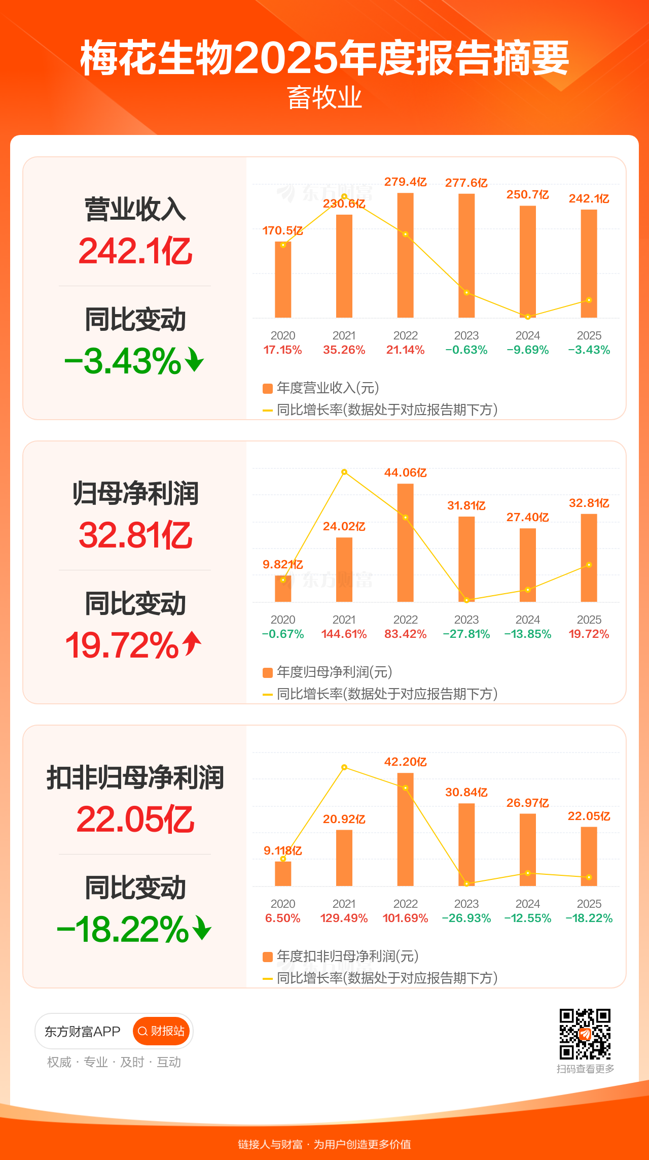梅花生物4月22日发布2025年年报显示,公司全年实现营业收入242.09亿元,同比下滑3.43%;归母净利润32.81亿元,同比增长19.72%;扣非归母净利润22.05亿元,同比下滑18.22%。