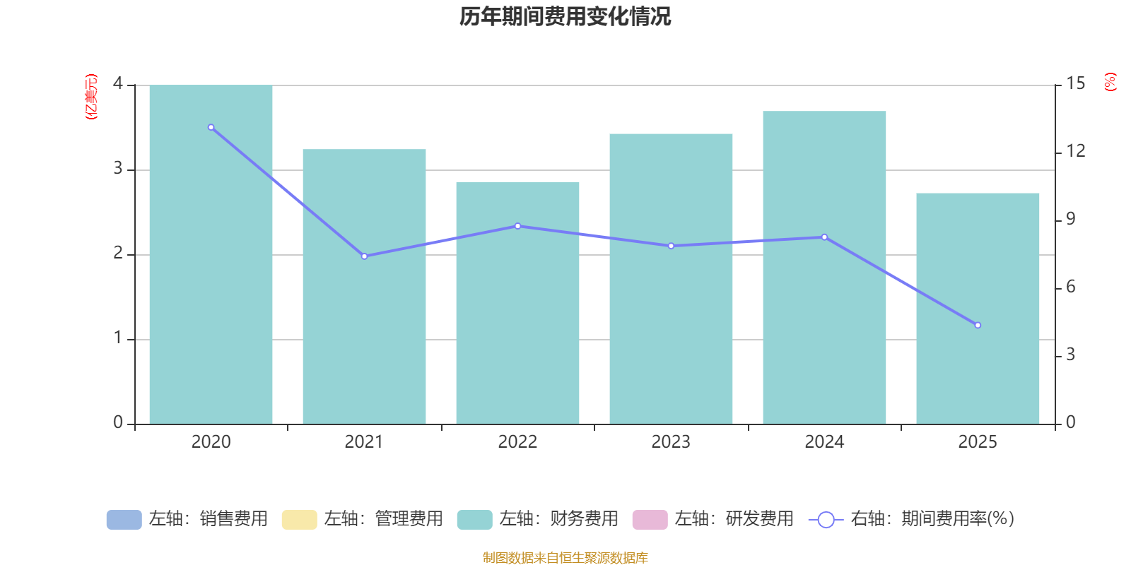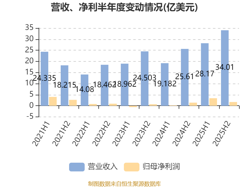 2025年,公司经营活动现金流净额为26.9亿美元,同比增长66.85%;筹资活动现金流净额-14.72亿美元,同比减少25.76亿美元;投资活动现金流净额-10.81亿美元,上年同期为-29.7亿美元。
