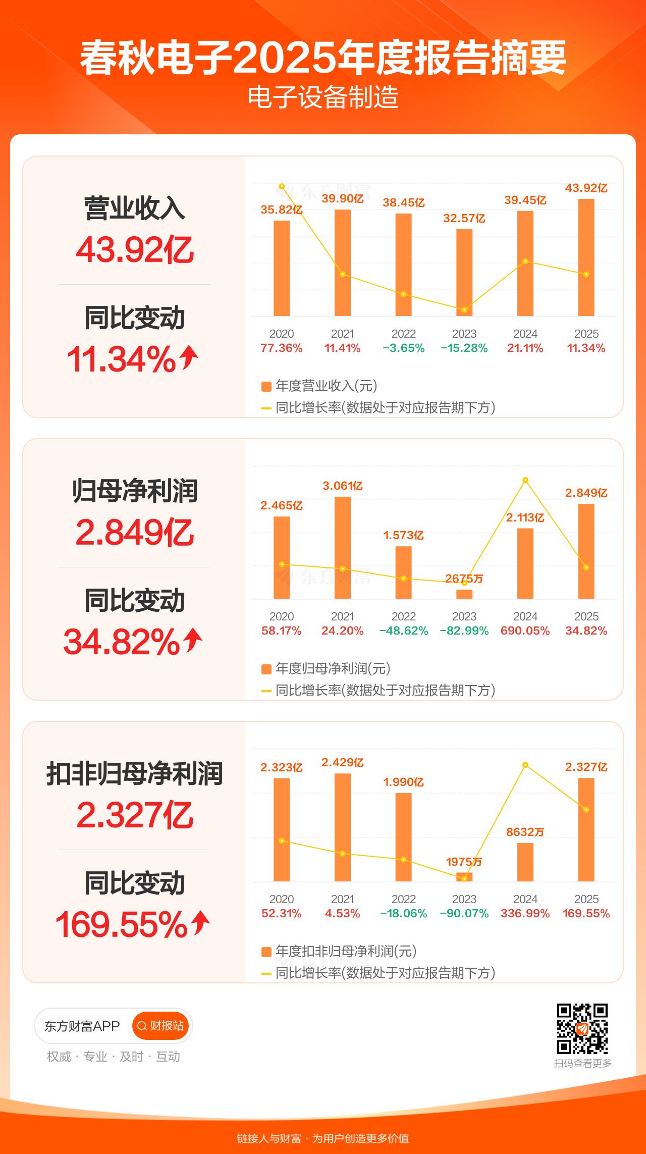 春秋电子4月22日发布2025年年报显示,公司全年实现营业收入43.92亿元,同比增长11.34%;归母净利润2.85亿元,同比增长34.82%;扣非归母净利润2.33亿元,同比增长169.55%。