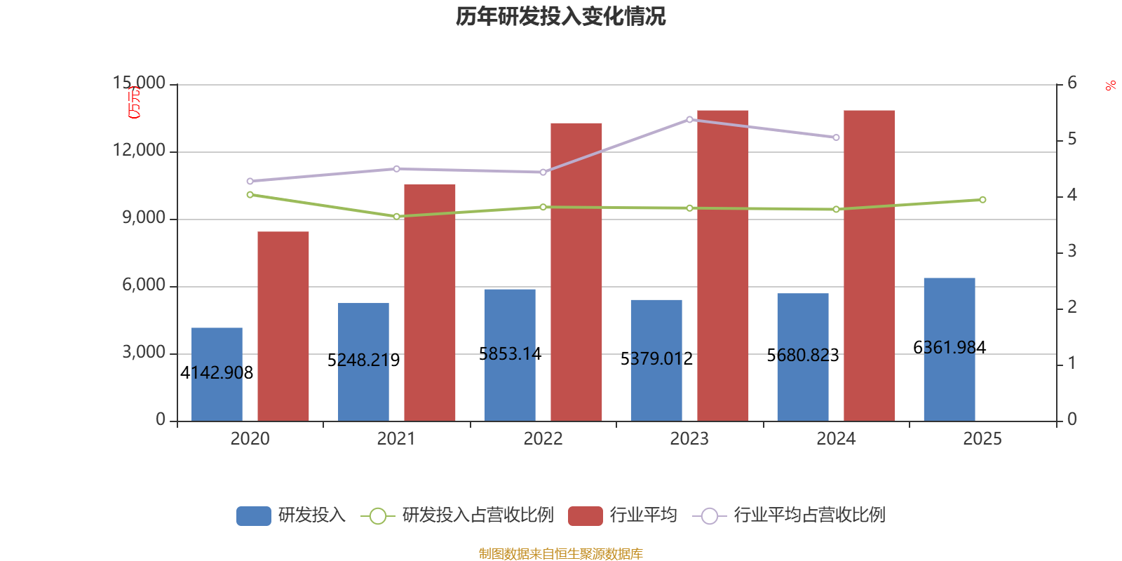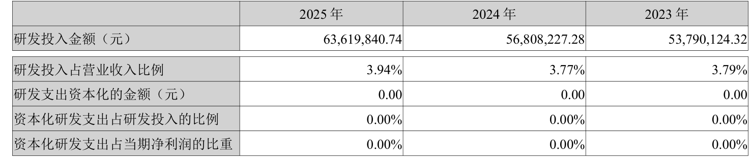 2025年全年,公司研发投入金额为6361.98万元,同比增长11.99%;研发投入占营业收入比例为3.94%,相比上年同期上升0.17个百分点。此外,公司全年研发投入资本化率为0%。