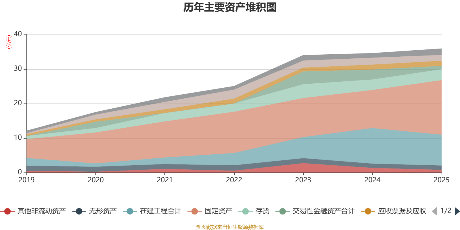 资产重大变化方面,截至2025年末,公司固定资产较上年末增加43.12%,占公司总资产比重上升12.07个百分点;交易性金融资产合计较上年末减少64.58%,占公司总资产比重下降5.48个百分点;在建工程合计较上年末减少13.37%,占公司总资产比重下降4.94个百分点;其他非流动资产较上年末减少42.6%,占公司总资产比重下降1.73个百分点。