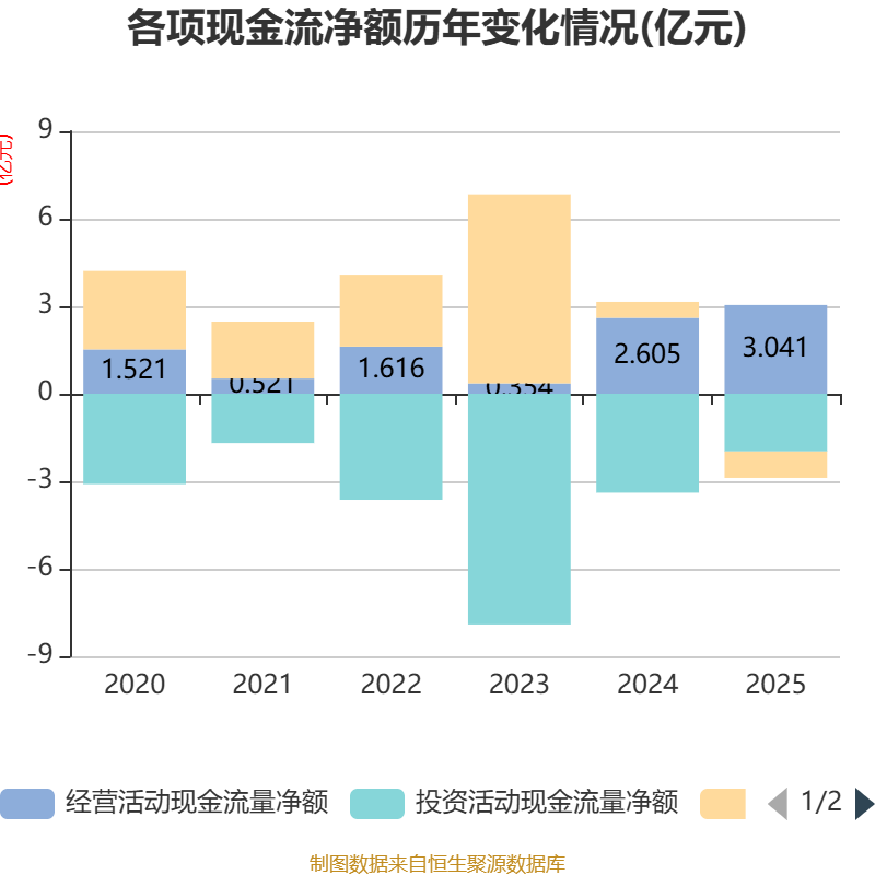 截至2025年,公司经营活动现金流净额为3.04亿元,同比增长16.73%;筹资活动现金流净额-9062.33万元,同比减少1.45亿元;投资活动现金流净额-1.98亿元,上年同期为-3.39亿元。