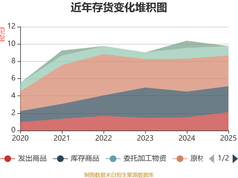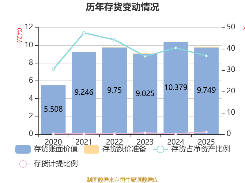 从存货变动来看,截至2025年末,公司存货账面价值为9.75亿元,占净资产的36.7%,较上年末减少6298.37万元。其中,存货跌价准备为1003.71万元,计提比例为1.02%。