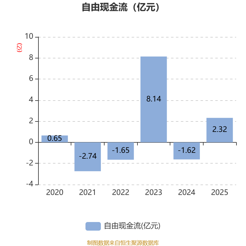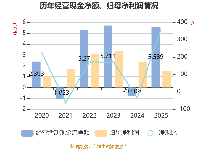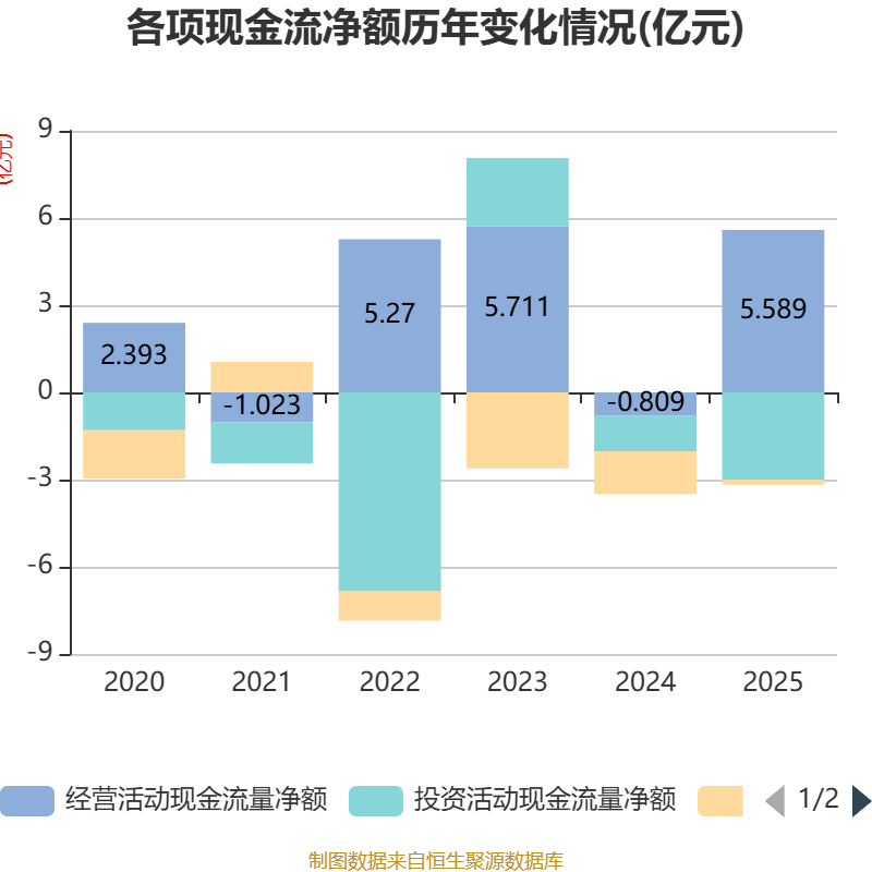 截至2025年,公司经营活动现金流净额为5.59亿元,同比增加6.4亿元;筹资活动现金流净额-1708.91万元,同比增加1.29亿元;投资活动现金流净额-3.01亿元,上年同期为-1.22亿元。