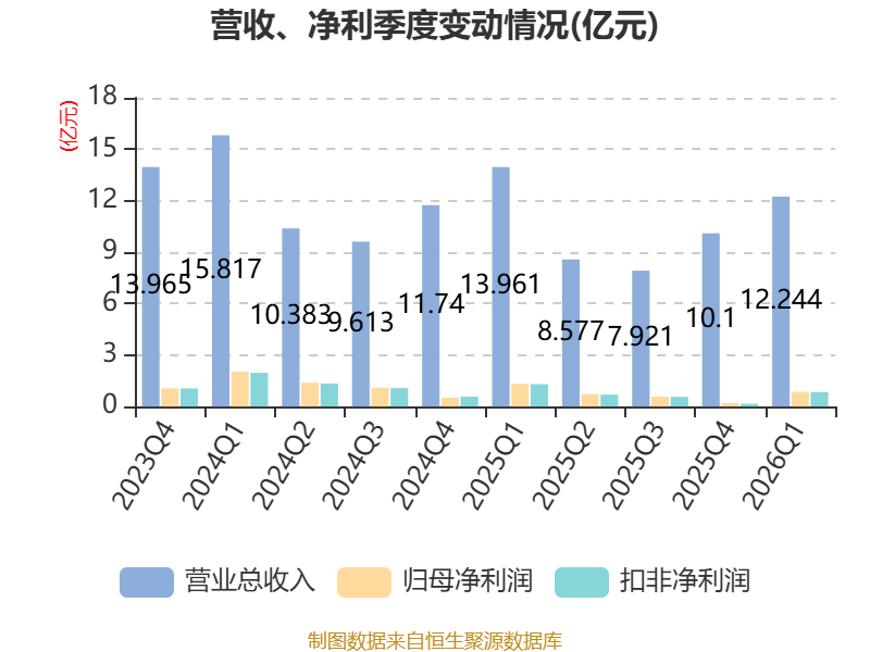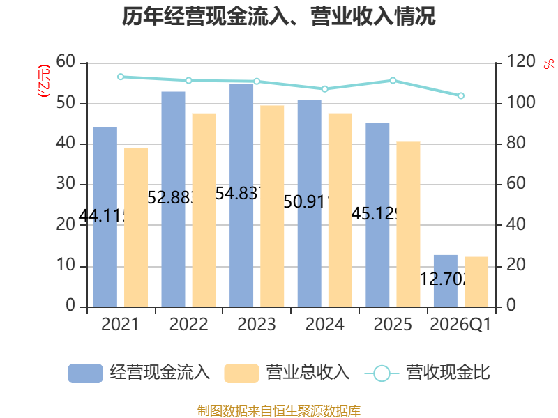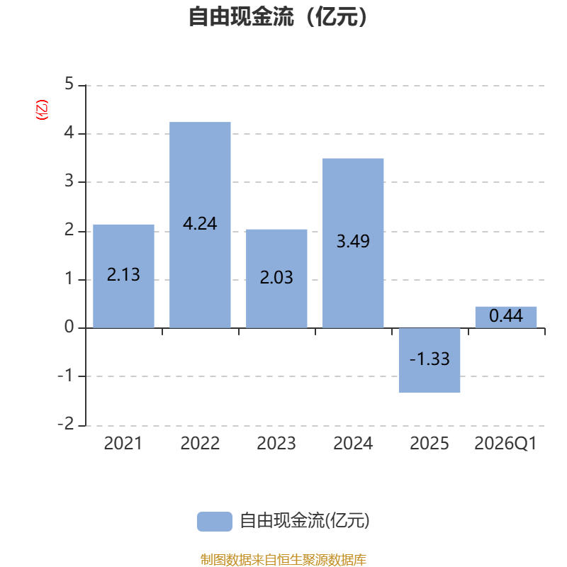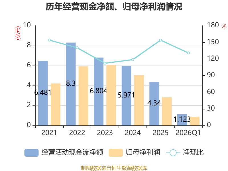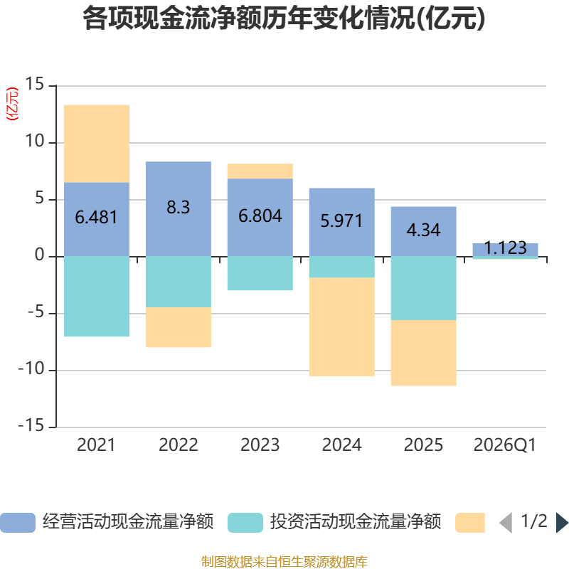截至2026年一季度末,公司经营活动现金流净额为1.12亿元,同比增长219.37%;筹资活动现金流净额-417.98万元,同比减少1931.84万元;投资活动现金流净额-2698.84万元,上年同期为-1941.66万元。