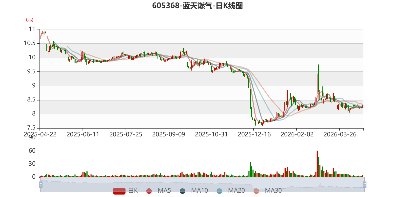 中证智能财讯蓝天燃气(605368)4月22日披露2026年第一季度报告。公司实现营业总收入12.24亿元,同比下降12.30%;归母净利润8580.34万元,同比下降35.01%;扣非净利润8425.33万元,同比下降35.49%;经营活动产生的现金流量净额为1.12亿元,同比增长219.37%;报告期内,蓝天燃气基本每股收益为0.12元,加权平均净资产收益率为2.58%。