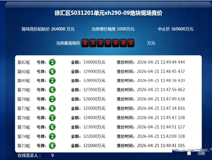 上海土地市场再次升温。4月21日,2026年第三批次宅地出让落下帷幕。徐汇长桥、普陀石泉、金山新城三幅地块共收金72.1亿元。其中,最引人注目的是徐汇长桥地块。经过82轮竞价,招商蛇口从9家头部房企中胜出,以25%的溢价率将其收入囊中。这也是今年以来,上海土拍溢价率首次突破25%。