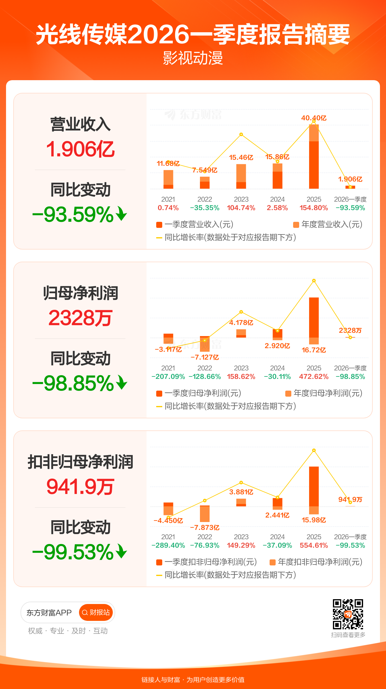 光线传媒4月22日发布2026年一季报显示,公司一季度实现营业收入1.91亿元,同比下滑93.59%;归母净利润2327.56万元,同比下滑98.85%;扣非归母净利润941.94万元,同比下滑99.53%。