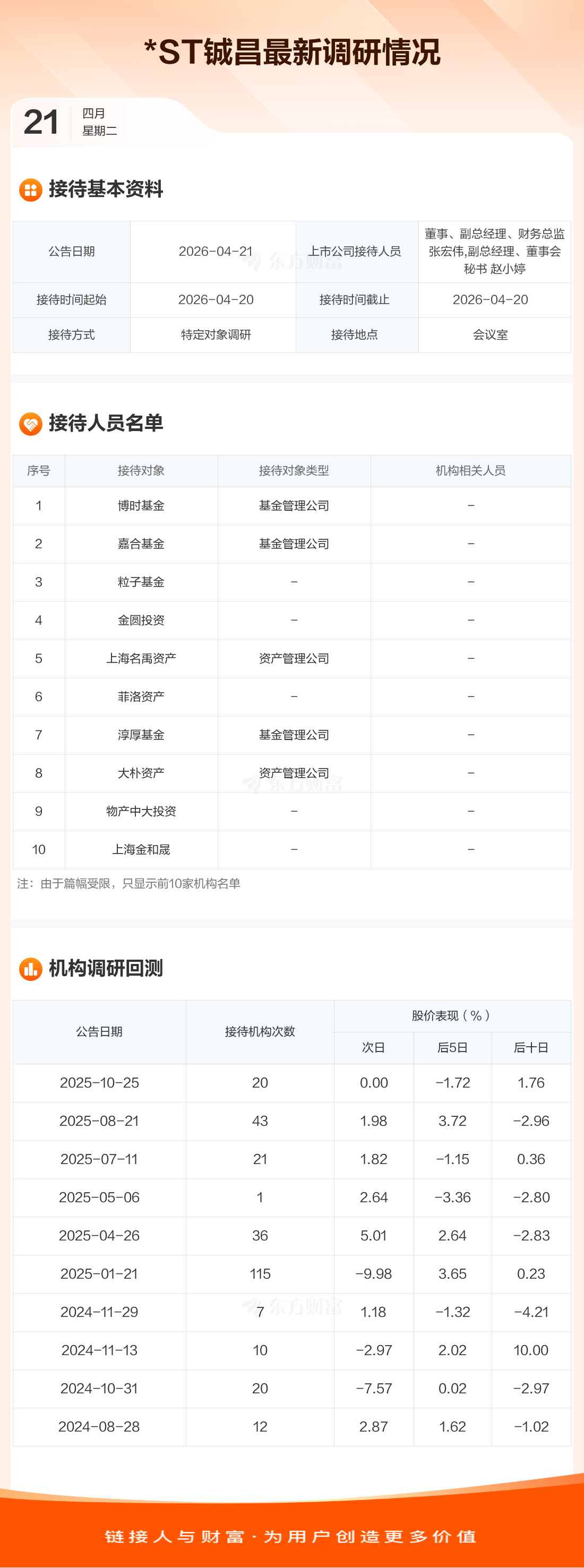 *ST铖昌4月21日公告称,4月20日接待博时基金等26家机构调研。接待人员包括董事、副总经理、财务总监 张宏伟,副总经理、董事会秘书 赵小婷。