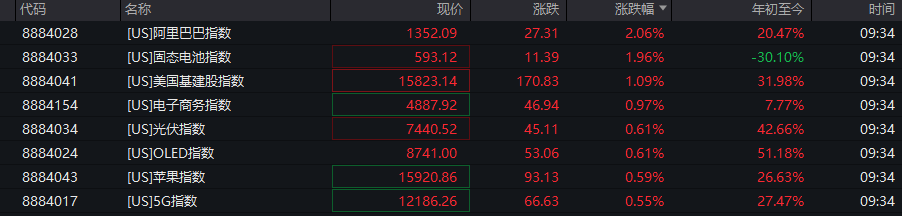 从板块表现看,万得美国阿里巴巴概念指数、固态电池指数及美国基建股指数涨幅位列前三。