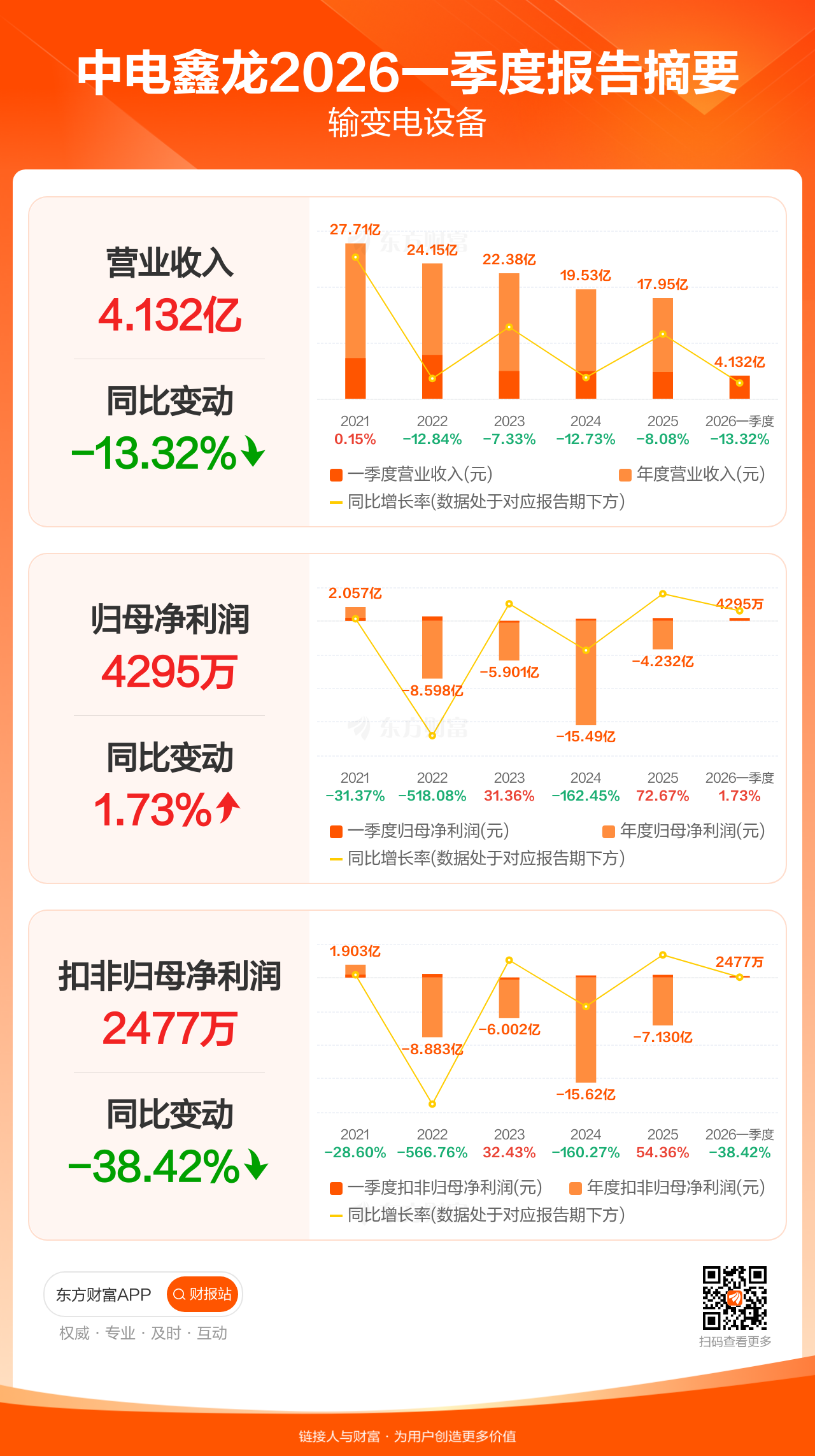 中电鑫龙4月22日发布2026年一季报显示,公司一季度实现营业收入4.13亿元,同比下滑13.32%;归母净利润4294.80万元,同比增长1.73%;扣非归母净利润2476.56万元,同比下滑38.42%。