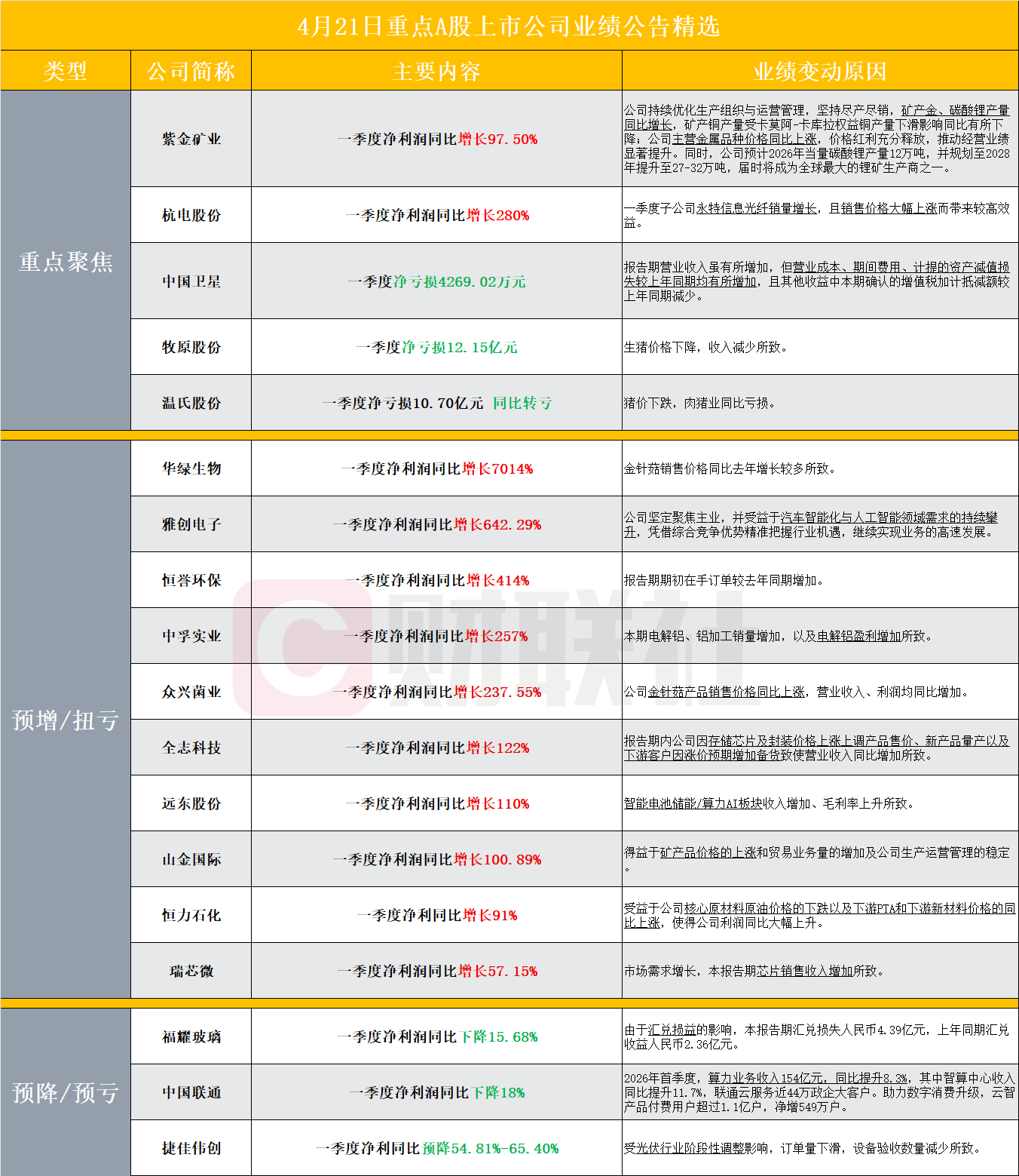 据财联社不完全统计,截至发稿,盘后包括紫金矿业、杭电股份、中国卫星、牧原股份、温氏股份、华绿生物、雅创电子、恒誉环保、中孚实业、众兴菌业、全志科技、远东股份、山金国际、恒力石化、瑞芯微、福耀玻璃、中国联通、捷佳伟创在内的多家A股上市公司发布2026年一季度业绩预告/报告。