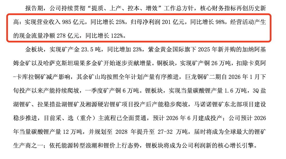 这是紫金矿业上市以来归母净利润首次单季突破200亿元大关,核心财务指标再创同期历史新高,锂业务已开始贡献实质性业绩。