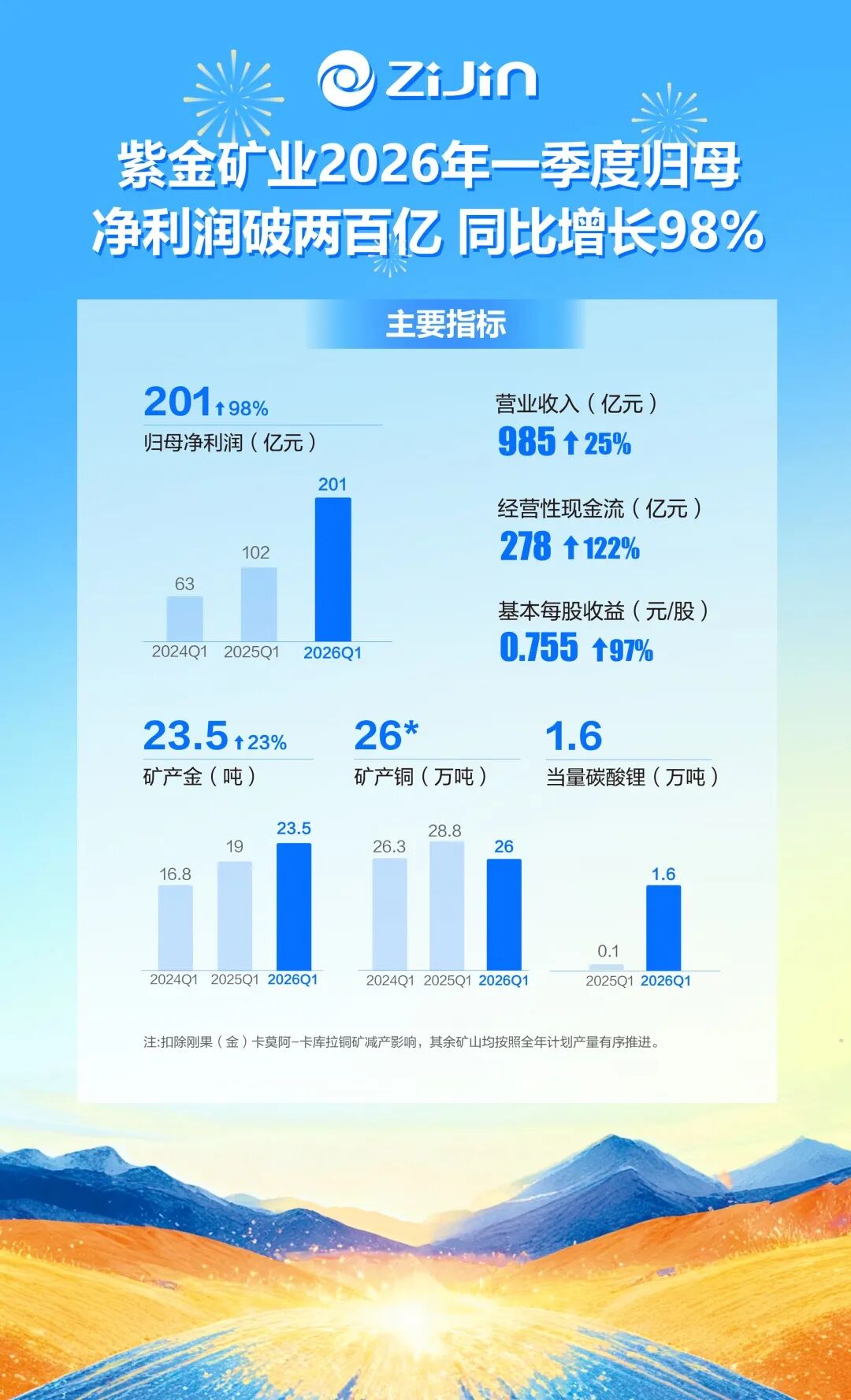 公司矿产金产量继续保持高增态势,一季度同比增长23%至23.5吨。按照计划,公司2026年计划实现矿产金105吨。