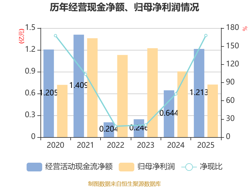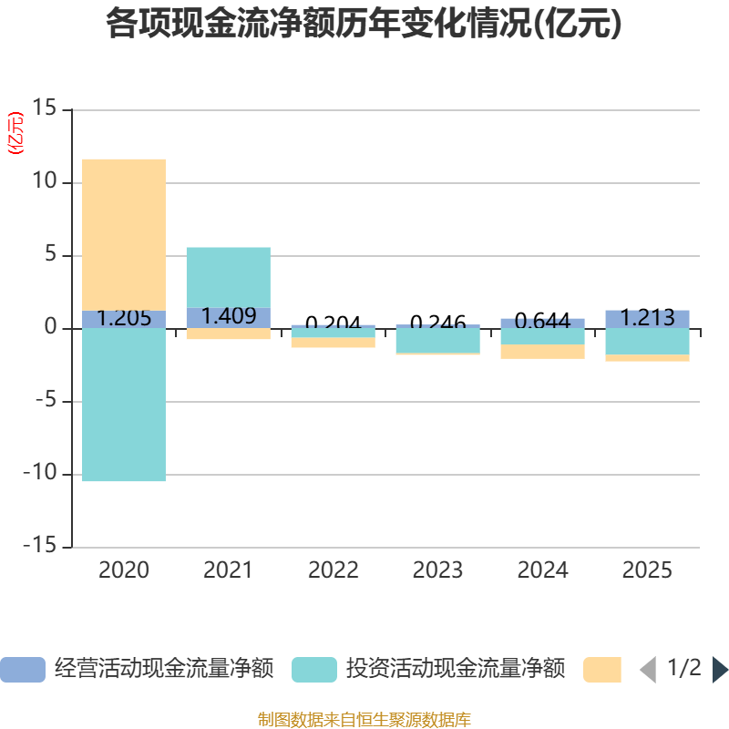 截至2025年,公司经营活动现金流净额为1.21亿元,同比增长88.39%;筹资活动现金流净额-4546.1万元,同比增加5332.77万元;投资活动现金流净额-1.83亿元,上年同期为-1.13亿元。