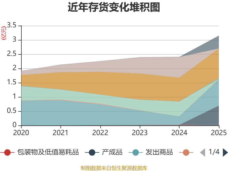从存货变动来看,截至2025年末,公司存货账面价值为3.15亿元,占净资产的18.45%,较上年末增加7451万元。其中,存货跌价准备为3009.75万元,计提比例为8.72%。