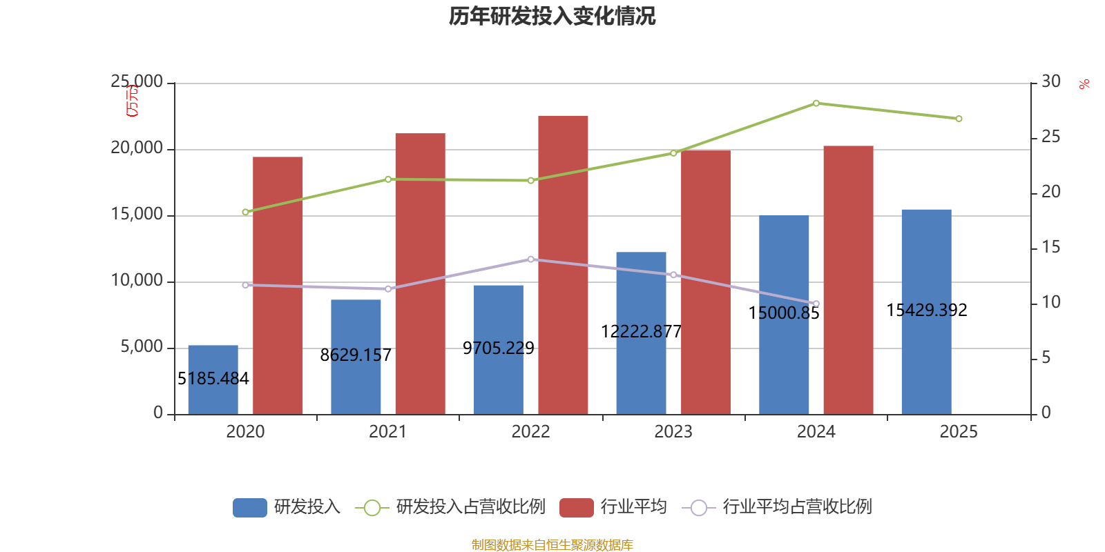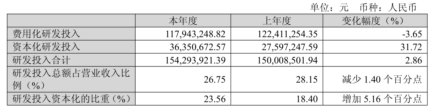 2025年全年,公司研发投入金额为1.54亿元,同比增长2.86%;研发投入占营业收入比例为26.75%,相比上年同期下降1.4个百分点。此外,公司全年研发投入资本化率为23.56%。