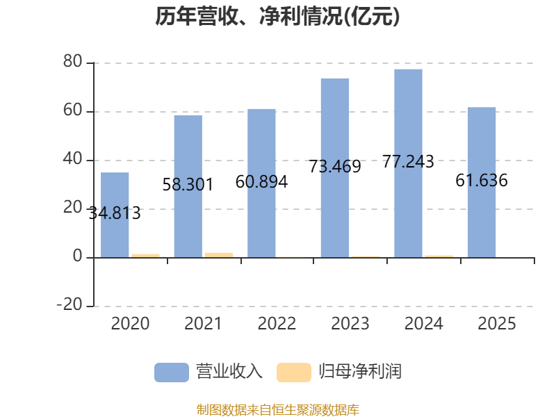 中证智能财讯众诚能源(02337)4月21日披露2025年度报告。报告期内,公司实现营业收入61.64亿元,同比下降20.2%;归母净利润亏损237.4万元,上年同期盈利6779.1万元;经营活动产生的现金流量净额为1219.7万元,同比下降35.4%;据报告显示,众诚能源基本每股收益为-0.01元,平均净资产收益率为-0.48%。
