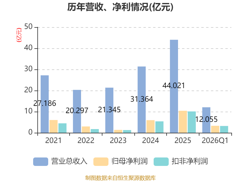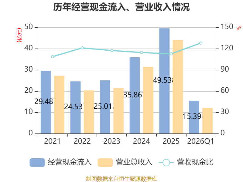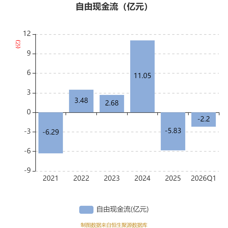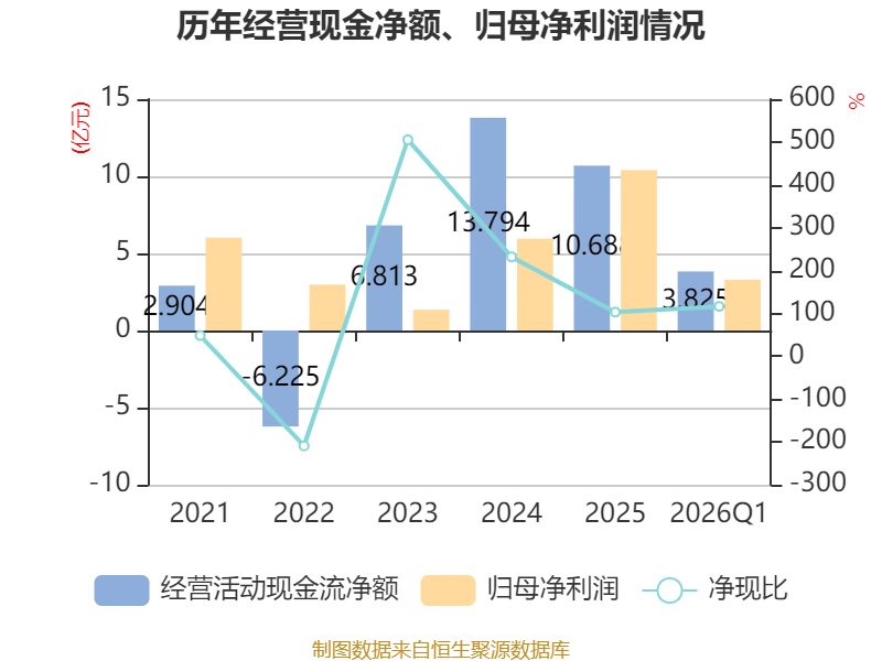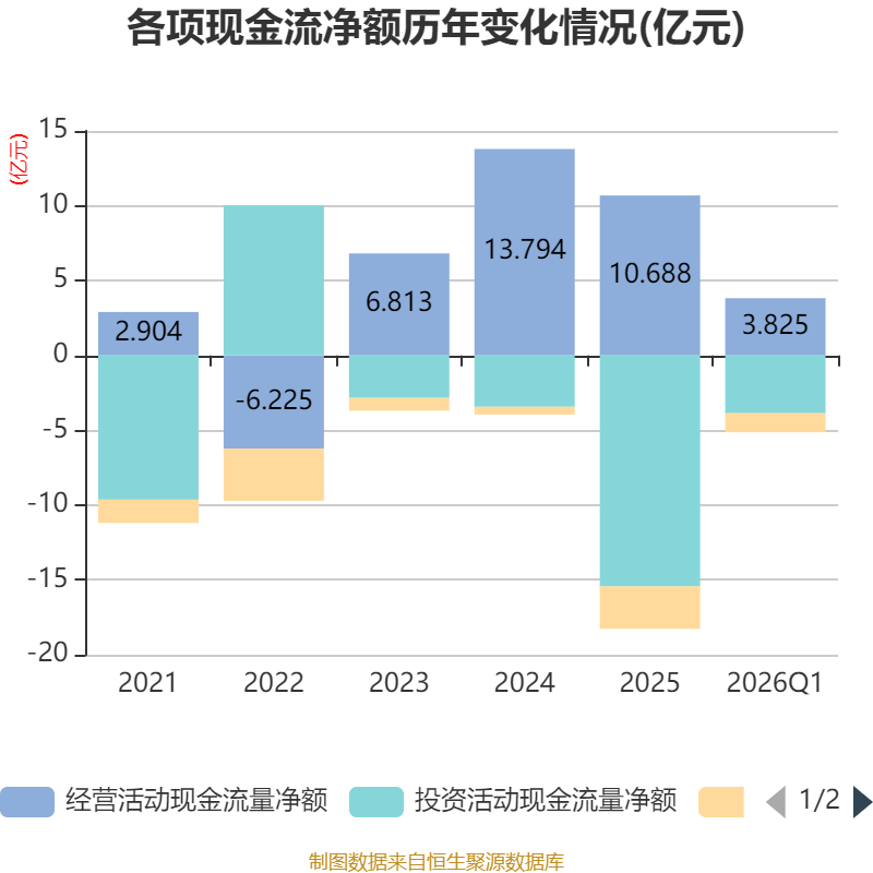 截至2026年一季度末,公司经营活动现金流净额为3.83亿元,同比增长22.77%;筹资活动现金流净额-1.27亿元,同比减少1944.12万元;投资活动现金流净额-3.86亿元,上年同期为-1.86亿元。