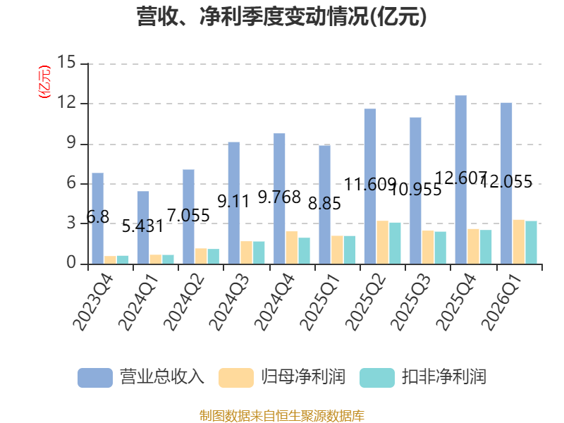 中证智能财讯瑞芯微(603893)4月22日披露2026年第一季度报告。公司实现营业总收入12.05亿元,同比增长36.22%;归母净利润3.29亿元,同比增长57.15%;扣非净利润3.2亿元,同比增长53.84%;经营活动产生的现金流量净额为3.83亿元,同比增长22.77%;报告期内,瑞芯微基本每股收益为0.78元,加权平均净资产收益率为7.23%。