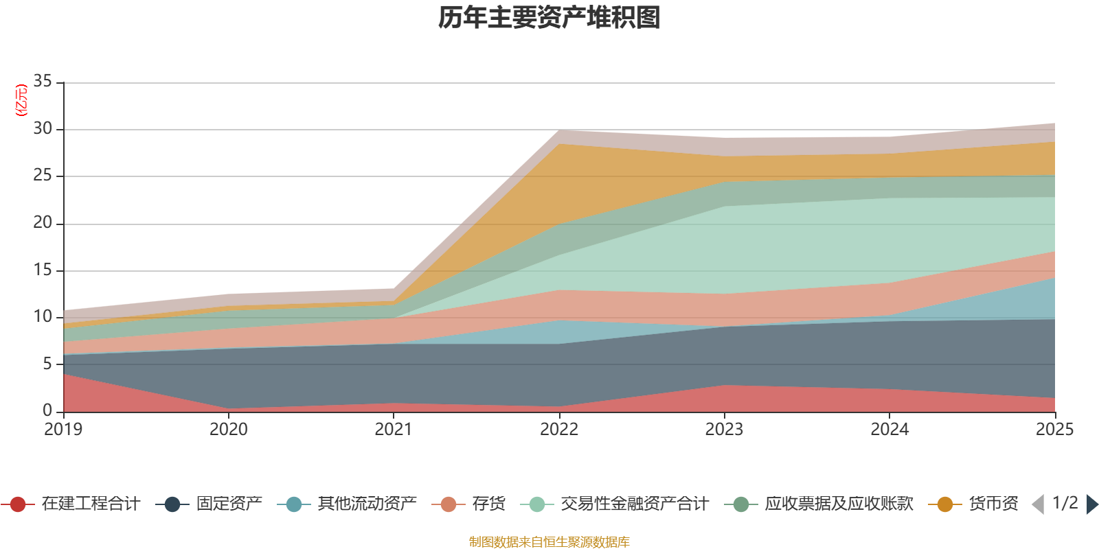 资产重大变化方面,截至2025年末,公司其他流动资产较上年末增加578.71%,占公司总资产比重上升12.17个百分点;交易性金融资产合计较上年末减少36.33%,占公司总资产比重下降12.13个百分点;在建工程合计较上年末减少38.84%,占公司总资产比重下降3.43个百分点;货币资金较上年末增加38.4%,占公司总资产比重上升2.76个百分点。