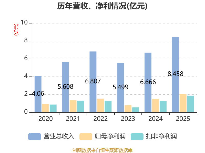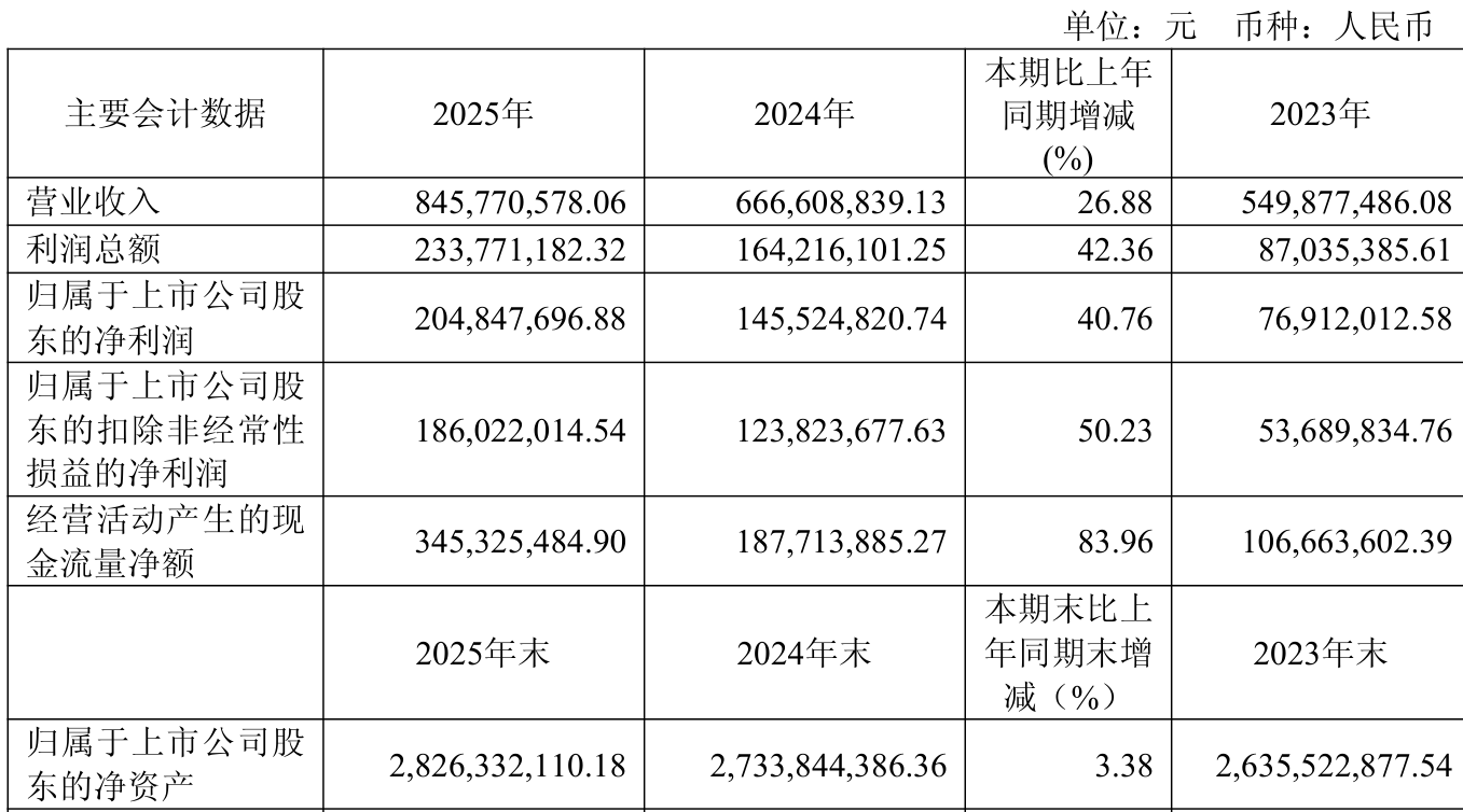 中证智能财讯中触媒(688267)4月22日披露2025年年度报告。2025年,公司实现营业总收入8.46亿元,同比增长26.88%;归母净利润2.05亿元,同比增长40.76%;扣非净利润1.86亿元,同比增长50.23%;经营活动产生的现金流量净额为3.45亿元,同比增长83.96%;报告期内,中触媒基本每股收益为1.18元,加权平均净资产收益率为7.30%。公司2025年度分配预案为:拟向全体股东每10股转3股,派现2元(含税)。
