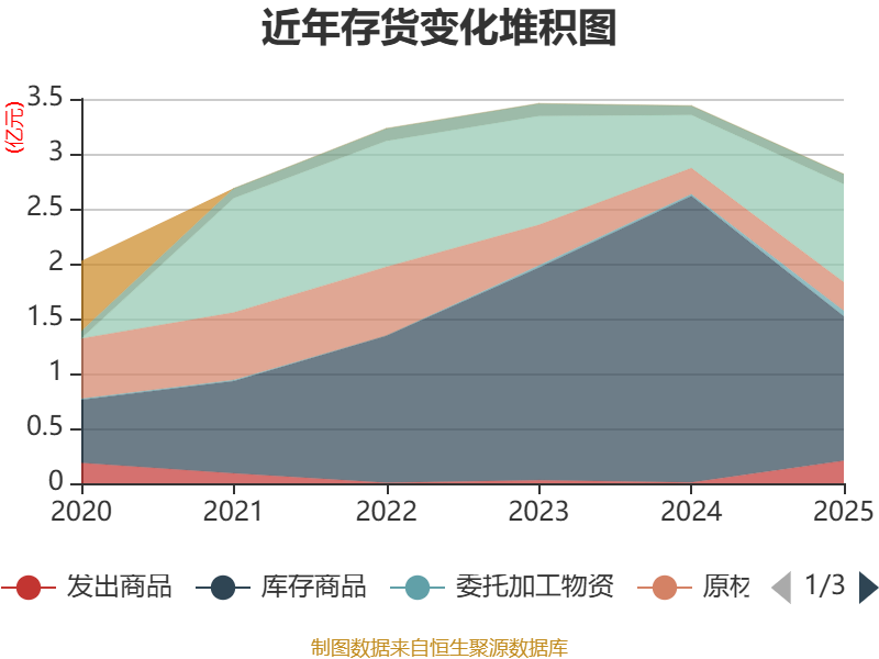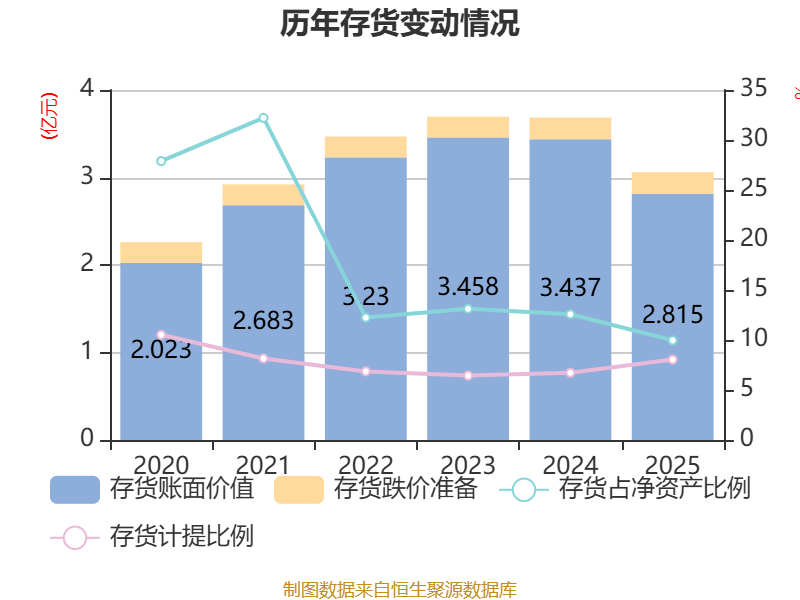 从存货变动来看,截至2025年末,公司存货账面价值为2.82亿元,占净资产的9.96%,较上年末减少6218.32万元。其中,存货跌价准备为2461.89万元,计提比例为8.04%。
