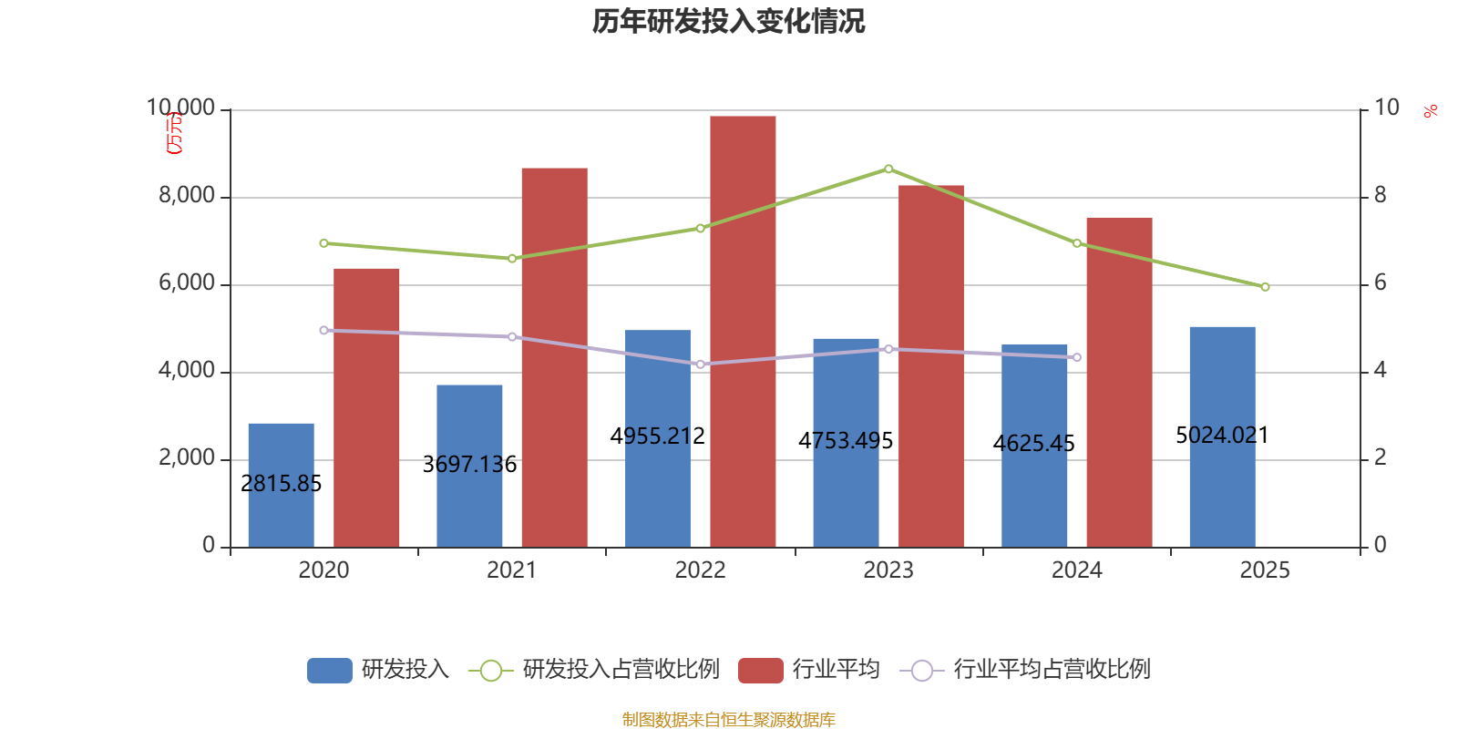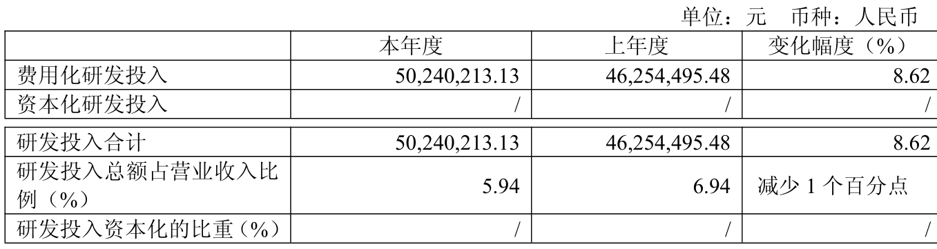 2025年全年,公司研发投入金额为5024.02万元,同比增长8.62%;研发投入占营业收入比例为5.94%,相比上年同期下降1个百分点。