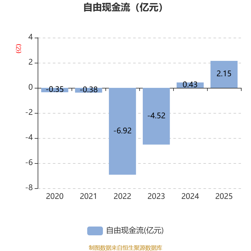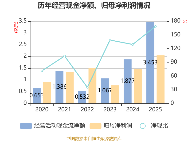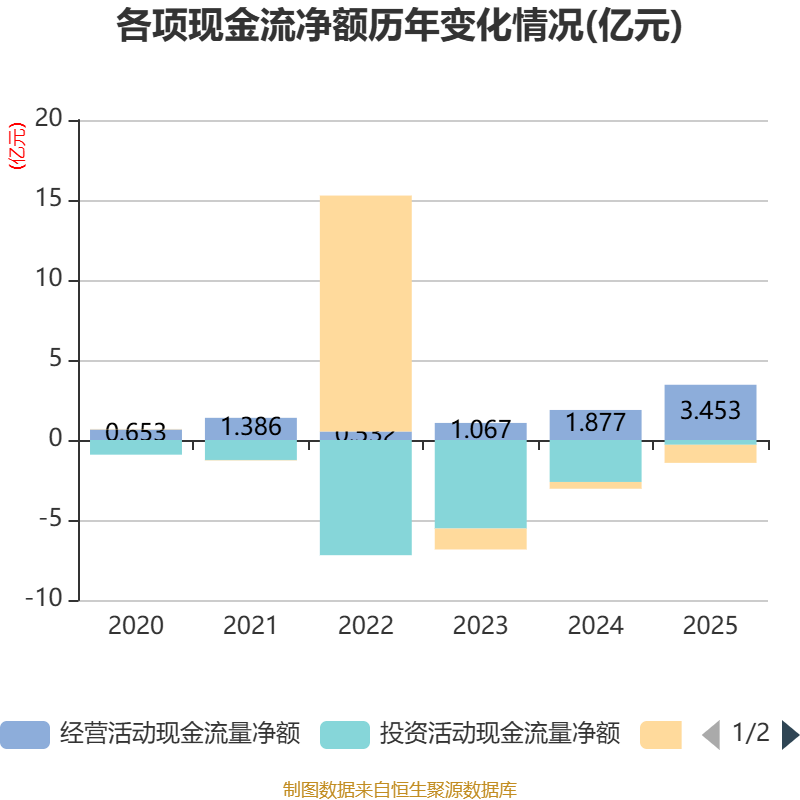 截至2025年,公司经营活动现金流净额为3.45亿元,同比增长83.96%;筹资活动现金流净额-1.13亿元,同比减少7068.2万元;投资活动现金流净额-2993.6万元,上年同期为-2.62亿元。