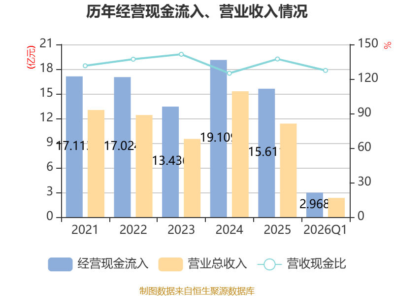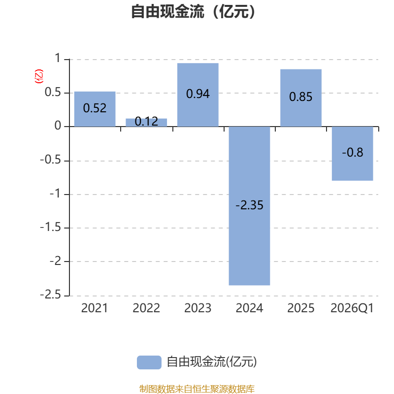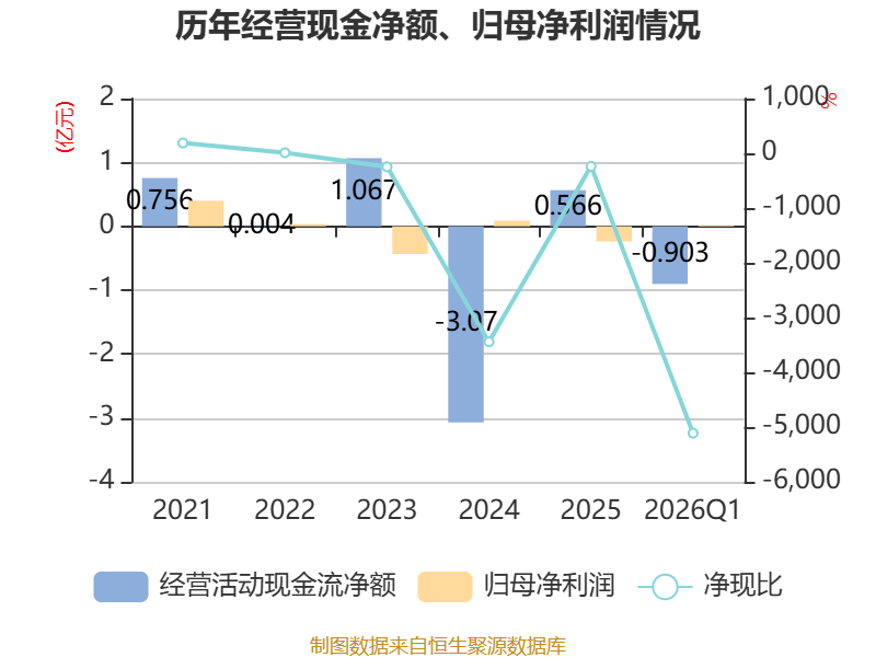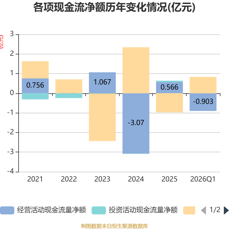 截至2026年一季度末,公司经营活动现金流净额为-9033.6万元,同比减少9123.51万元;筹资活动现金流净额8323.29万元,同比增加3362.59万元;投资活动现金流净额7843.34元,上年同期为-52.14万元。