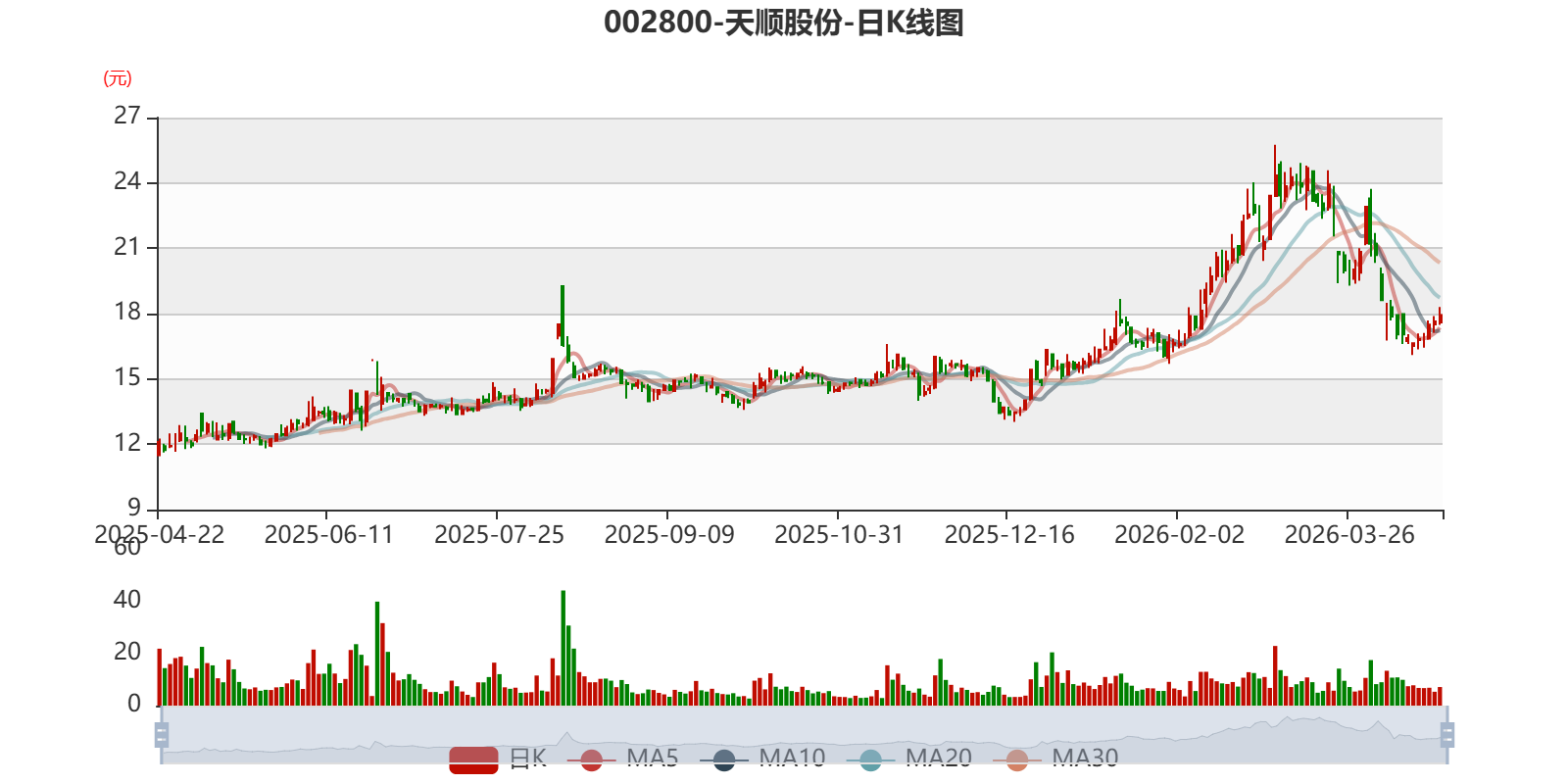 中证智能财讯天顺股份(002800)4月22日披露2026年第一季度报告。公司实现营业总收入2.33亿元,同比下降5.22%;归母净利润176.73万元,同比下降8.65%;扣非净利润151.7万元,同比下降5.88%;经营活动产生的现金流量净额为-9033.6万元,上年同期为89.91万元;报告期内,天顺股份基本每股收益为0.0116元,加权平均净资产收益率为0.36%。