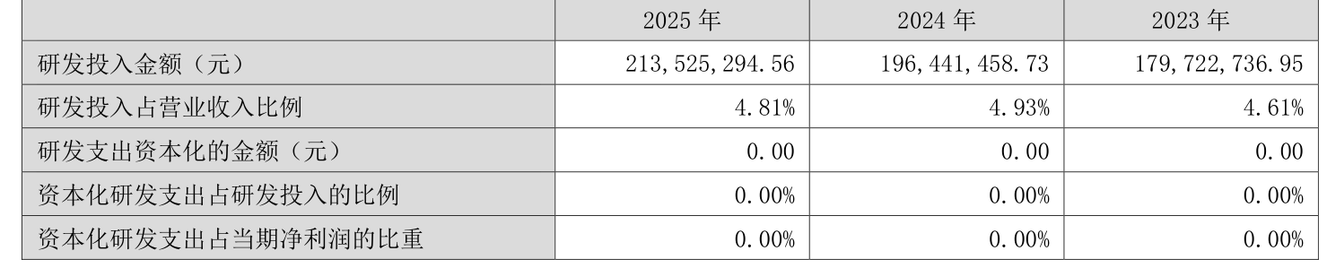 2025年全年,公司研发投入金额为2.14亿元,同比增长8.7%;研发投入占营业收入比例为4.81%,相比上年同期下降0.12个百分点。此外,公司全年研发投入资本化率为0%。