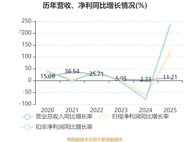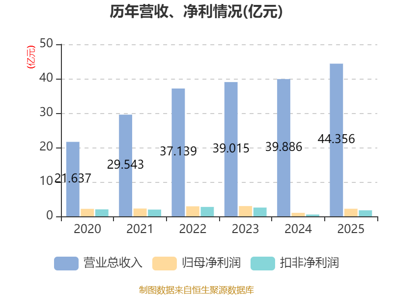 中证智能财讯回天新材(300041)4月22日披露2025年年度报告。2025年,公司实现营业总收入44.36亿元,同比增长11.21%;归母净利润2.21亿元,同比增长116.58%;扣非净利润1.76亿元,同比增长233.98%;经营活动产生的现金流量净额为3.05亿元,同比增长66.33%;报告期内,回天新材基本每股收益为0.3979元,加权平均净资产收益率为7.53%。公司2025年度分配预案为:拟向全体股东每10股派现1.5元(含税)。