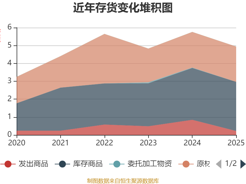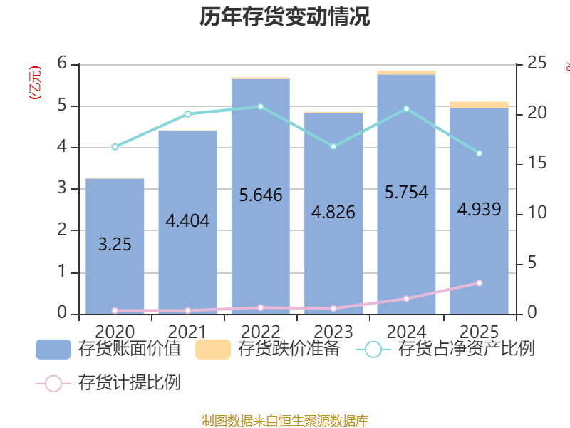 从存货变动来看,截至2025年末,公司存货账面价值为4.94亿元,占净资产的16.09%,较上年末减少8155.04万元。其中,存货跌价准备为1576.41万元,计提比例为3.09%。