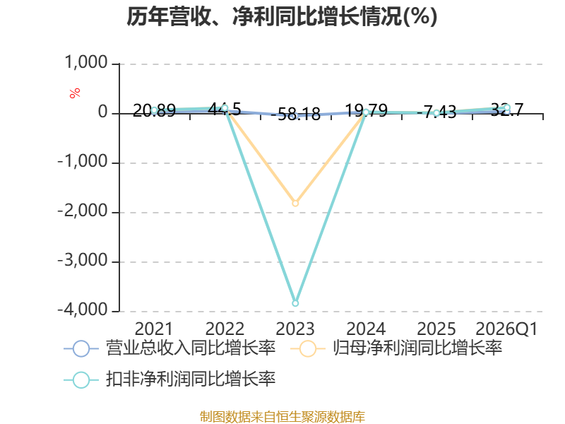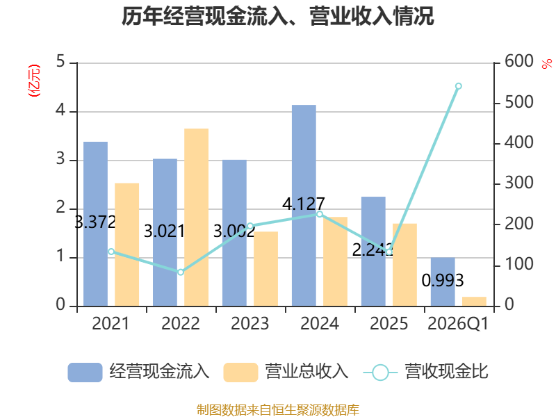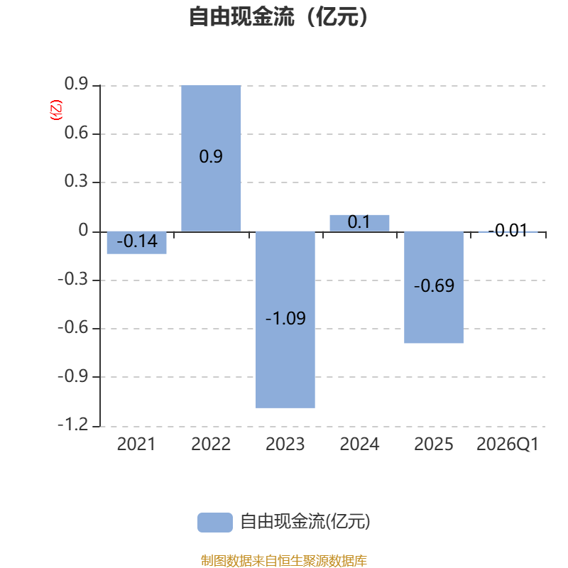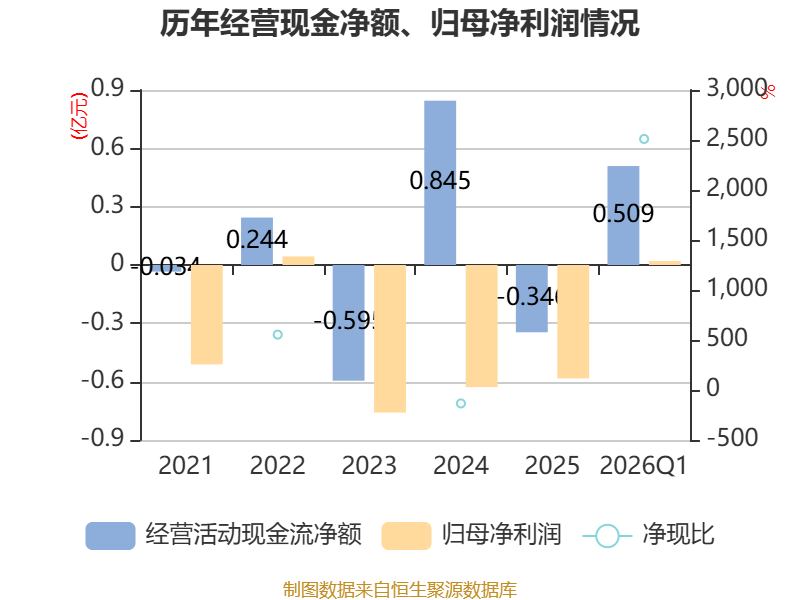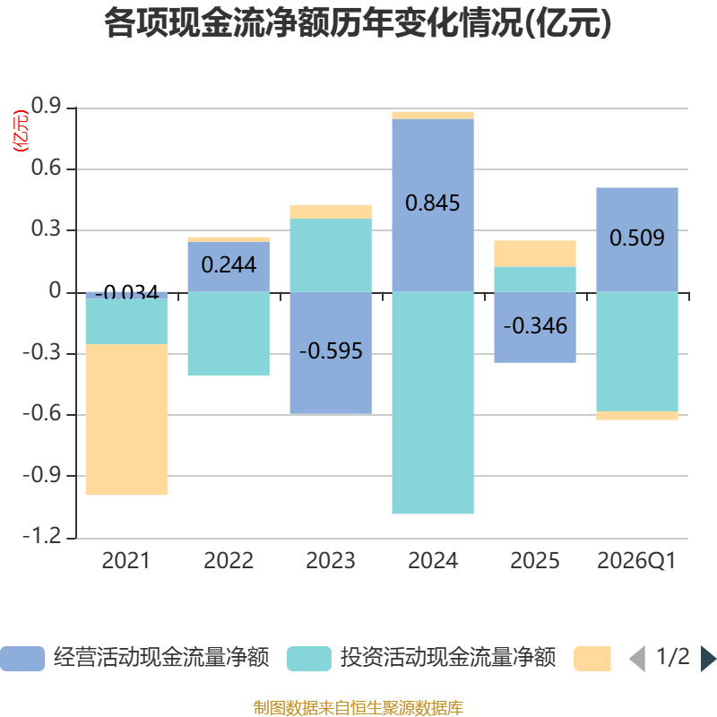 截至2026年一季度末,公司经营活动现金流净额为5091.3万元,同比增加6423.93万元;筹资活动现金流净额-421.86万元,同比减少1426.53万元;投资活动现金流净额-5826.81万元,上年同期为-2001.7万元。